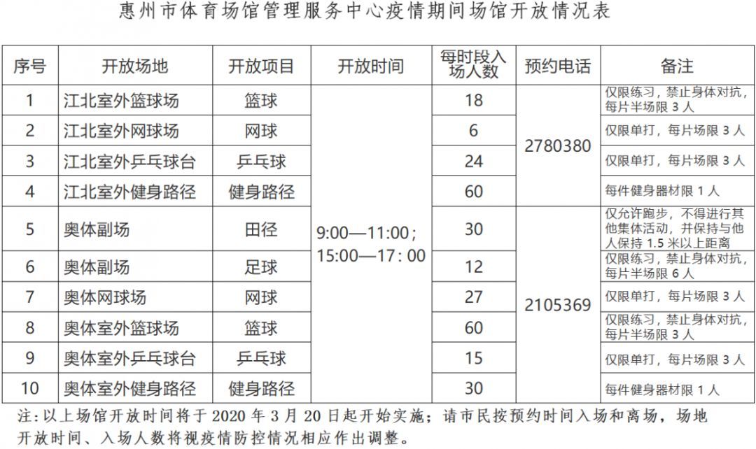 好消息终于来了!从3月20日开始,惠州市体育场馆服务管理中心的室外场地将对外开放,并实施限时限流预约服务。开放时间为上午9:00-11:00,下午15:00-17:00,市民需提前一天进行电话预约。
