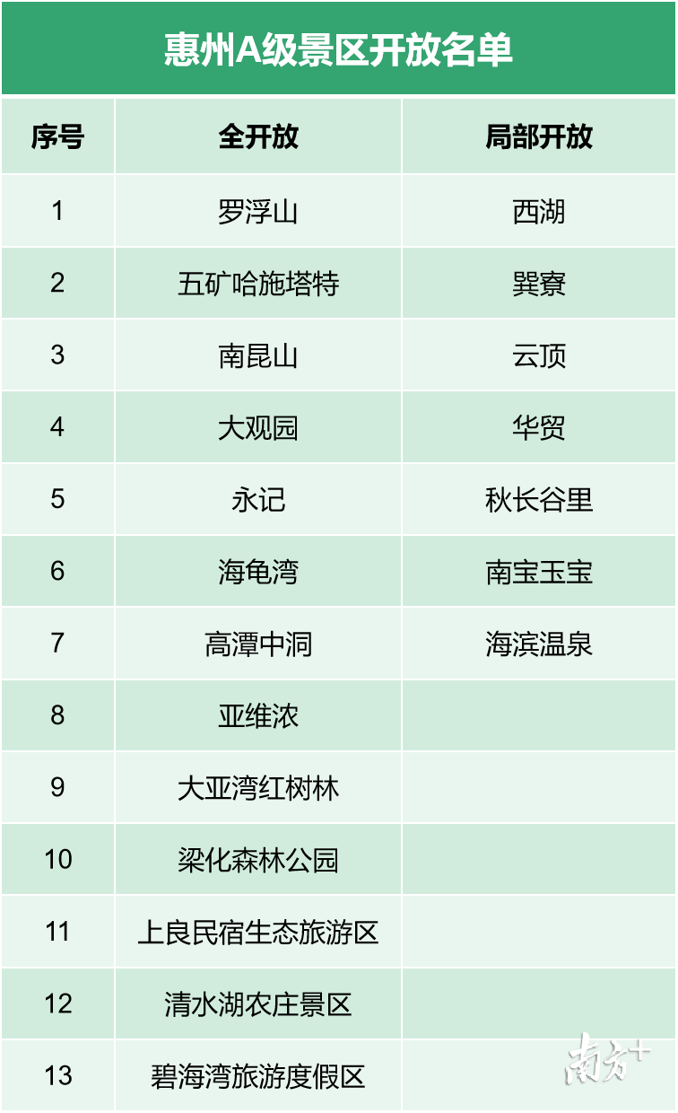 据惠州市文广旅体局统计,截至4月15日,惠州全市36家A级景区中有20家恢复开放,其中罗浮山、五矿·哈施塔特、南昆山、大观园、永记、海龟湾、高潭中洞、亚维浓、大亚湾红树林、梁化森林公园、上良民宿生态旅游区、清水湖农庄景区、碧海湾旅游度假区共13家景区全部对外开放,西湖、巽寮、云顶、华贸、秋长谷里、南宝玉宝、海滨温泉共7家景区局部对外开放。