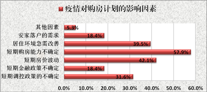 调查结果显示,调研结果显示,购房者因短期收入下降或断档问题,导致短期购房能力的不确定性,对购房者的购买计划影响最大,占比达57.9%。