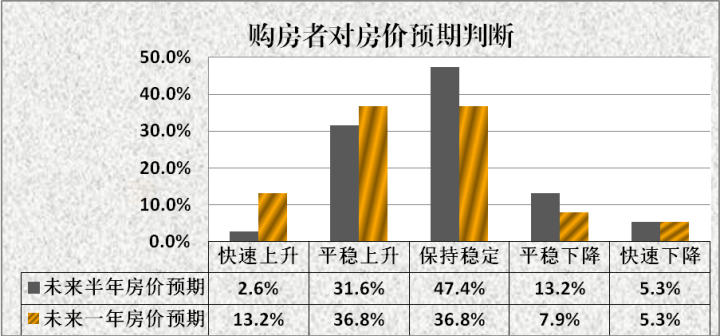 而对未来一年的房价预期,则接近九成购房者认为将保持稳定或上升,乐观的购房者有所增加,其中认为上升的占比达到50.0%。