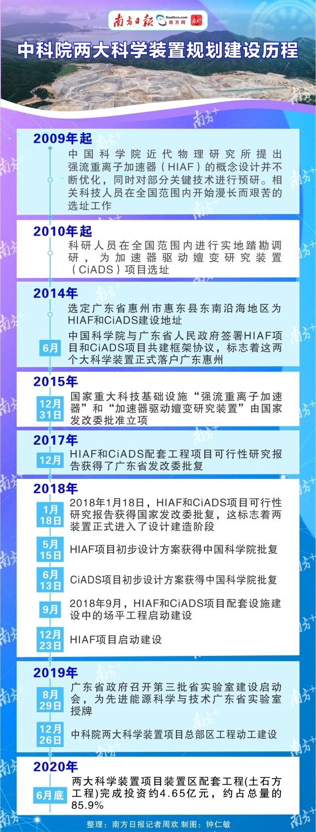 早在2009年,中科院近代物理研究所就提出HIAF的概念设计并不断优化,同时对部分关键技术进行预研。此后,科研人员在全国范围内广泛踏勘调研,为HIAF和CiADS项目选址,最终在2014年选定广东省惠州市惠东县。