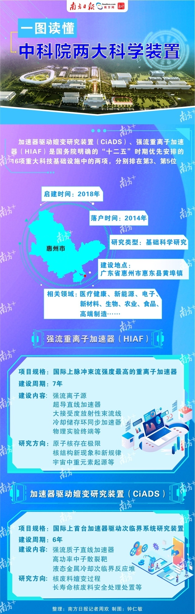 中国科学院近代物理研究所副所长胡正国告诉南方日报、南方+记者,“十二五”时期国家优先安排的16项重大科技基础设施中的两项——强流重离子加速器装置(HIAF)、加速器驱动嬗变研究装置(CiADS)就落户在这里。