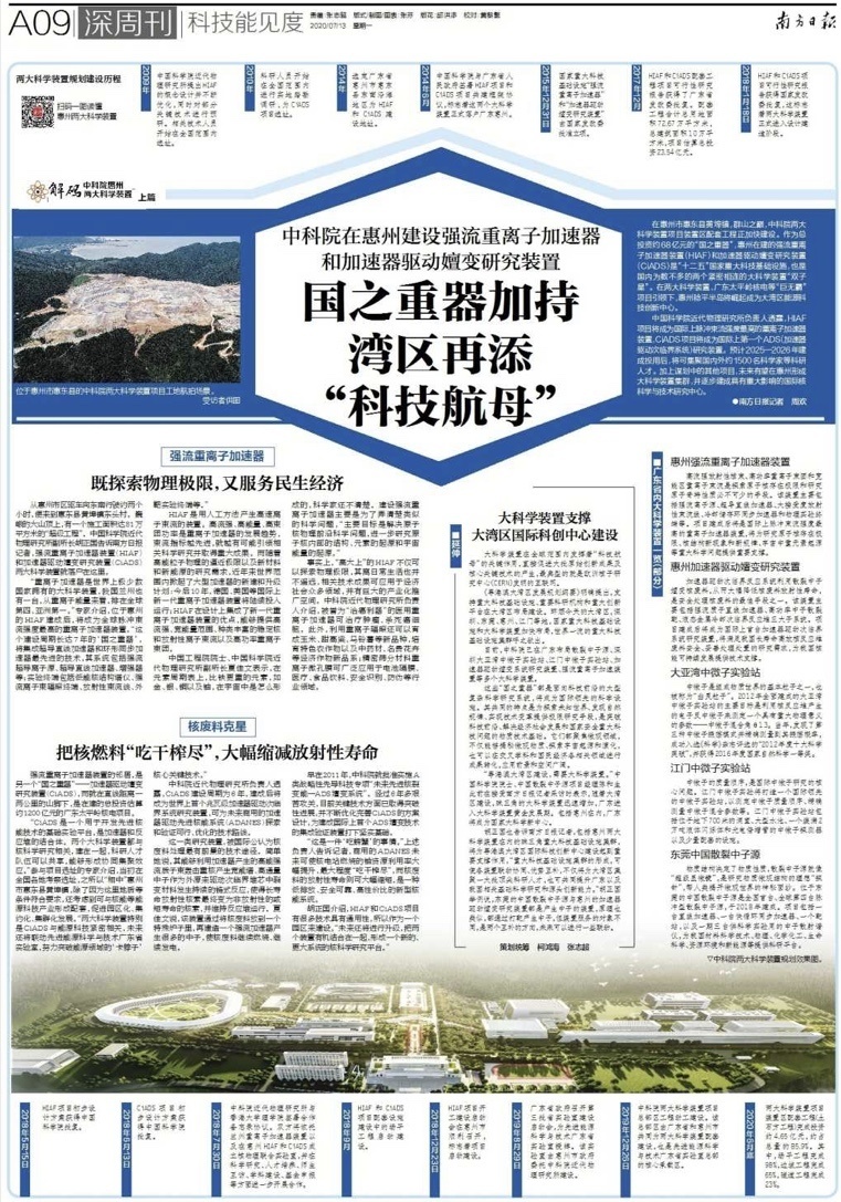 目前,中科院已在广东布局散裂中子源、深圳大亚湾中微子实验站、江门中微子实验站、加速器驱动嬗变系统研究装置、强流重离子加速装置等多个大科学装置。