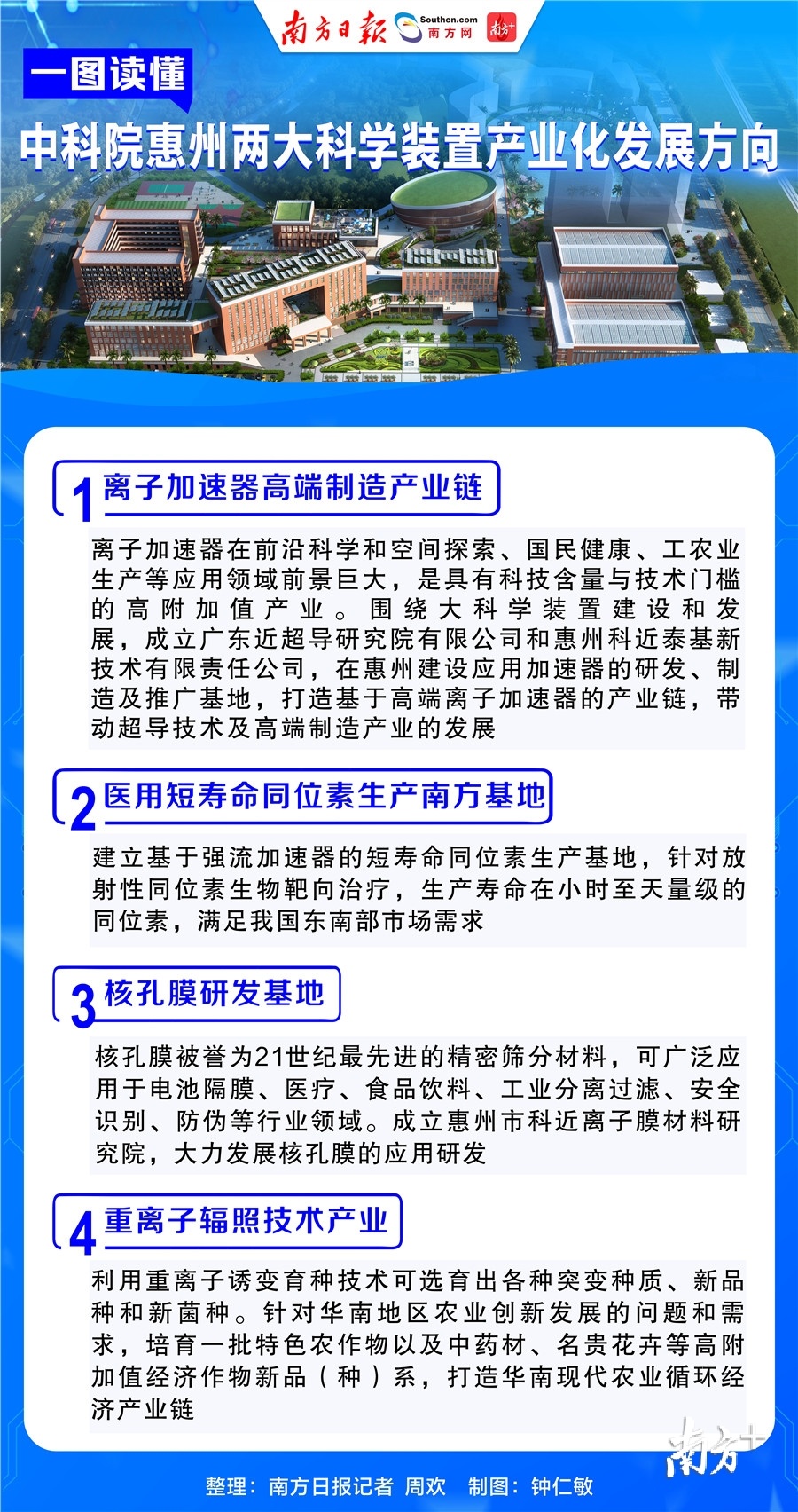中科院近代物理研究所副所长胡正国介绍,正在惠州部署开展产业化工作,包括谋划建设离子加速器高端制造产业链、医用短寿命同位素生产南方基地、核孔膜研发基地、重离子辐照技术产业等。(详见《中科院近代物理所副所长胡正国:打造惠州国际核物理研究中心》)