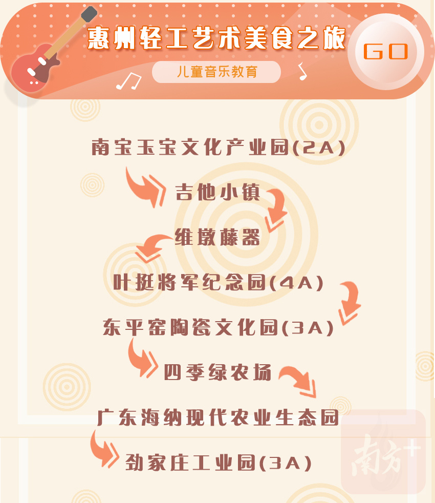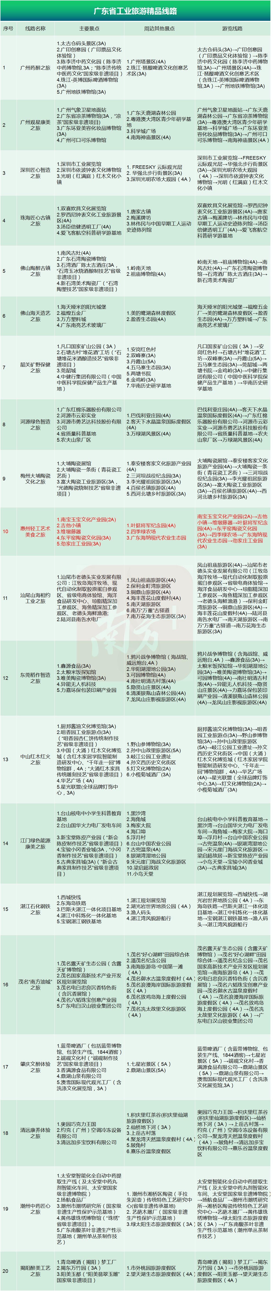 4日,广东省文化和旅游厅、广东省工业和信息厅联合发布20条广东省工业旅游精品线路,涵盖广州、深圳、珠海等18个地市。其中惠州轻工艺术美食之旅线路上榜,串联了吉他小镇、维墩藤器、东平窑和劲家庄等极具代表性的工业旅游景点。