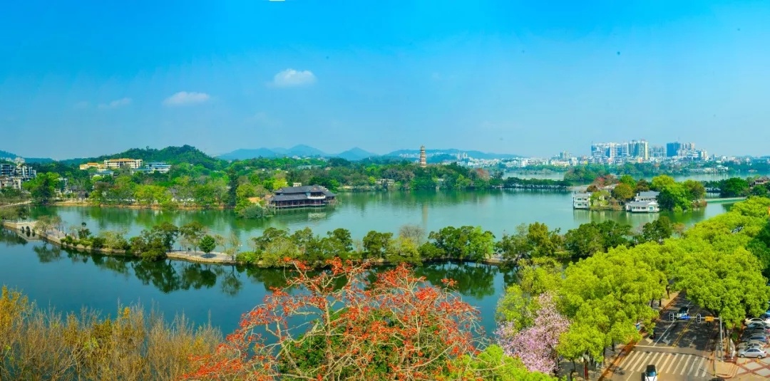 惠州西湖由南湖、丰湖、平湖、鳄湖和菱湖组成,是国家AAAAA级景区。西湖景区是开放景区,环西湖(五湖)一周约16公里,可以从多处入口做为起终点。