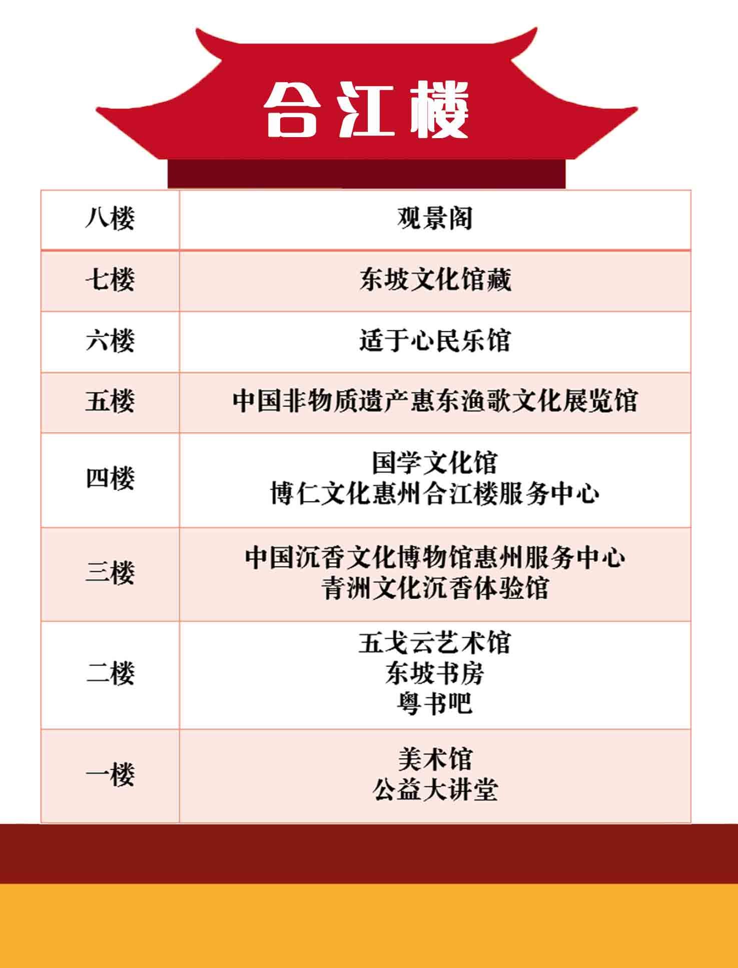 2006年,惠州市政府觅址重建合江楼,并于2018年引进团队重新盘活运营,现已引进美术馆、艺术馆、非遗展览馆、民乐馆等多个项目进场。重建后的新合江楼位于市区桥东东新桥桥头东江、西枝江交汇处,登上合江楼可饱览江景,这里将打造成为惠州的一张文化名片和文旅新地标。