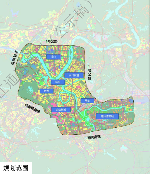 该规划的范围是东江、西枝江、新开河流域在惠城区的主要腹地,即“四环内”+“惠州湾产业新城”,包含东江段(剑潭至汝湖段)全长23.5公里、西枝江段(桥东至惠州湾产业新城段)全长20公里、新开河段(东平段)全长2.5公里。