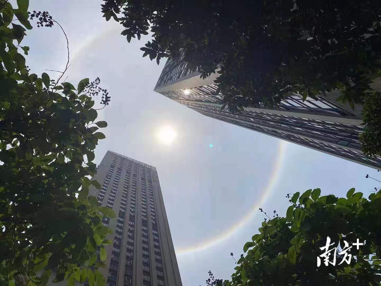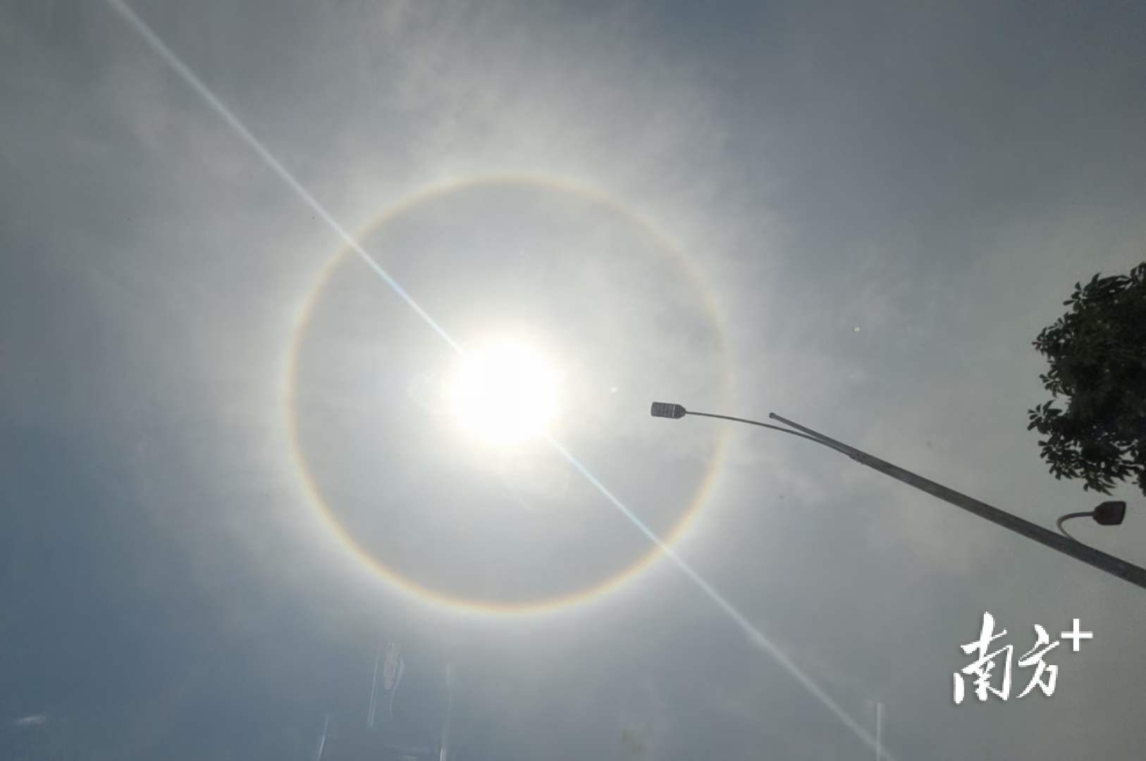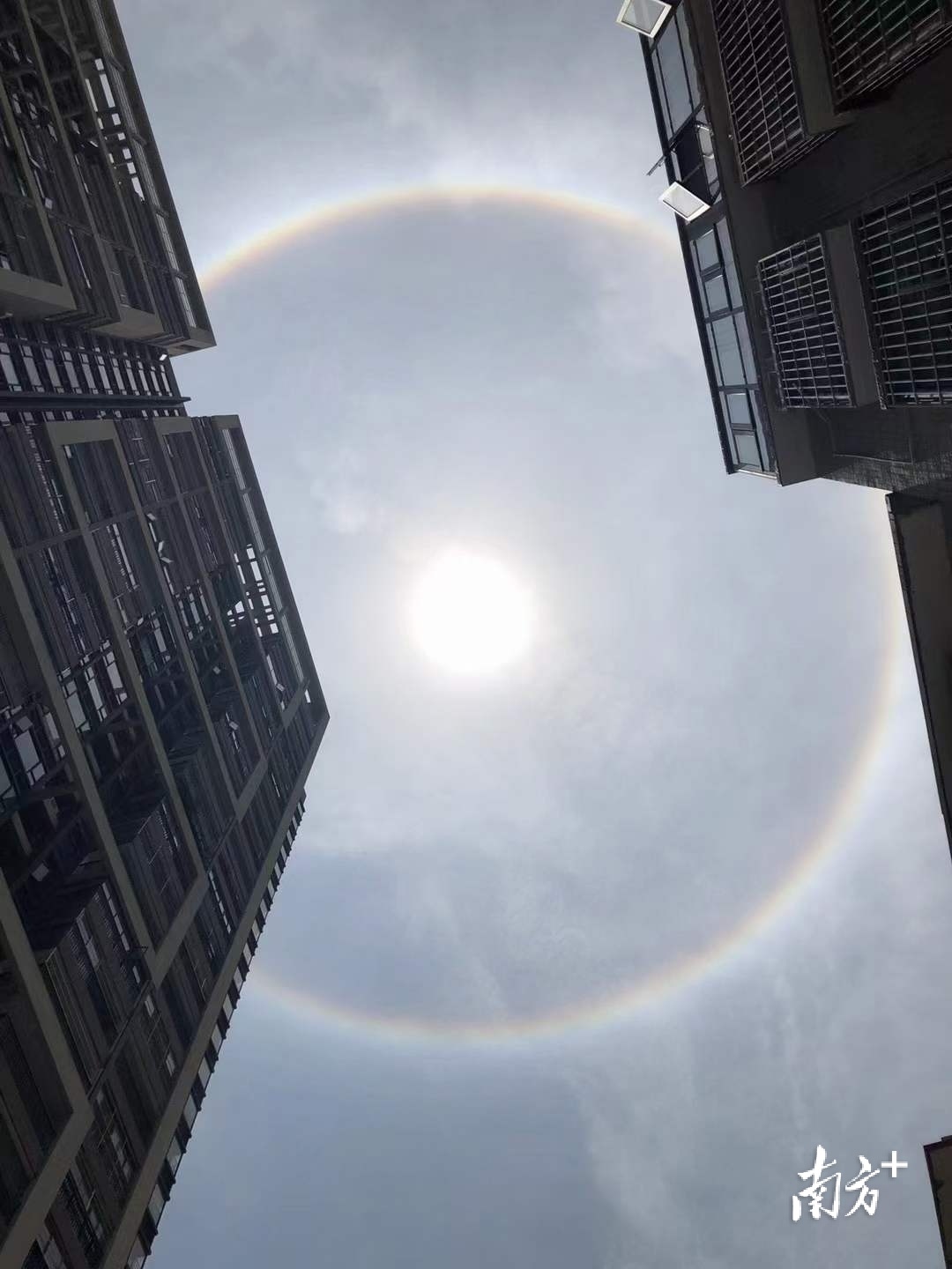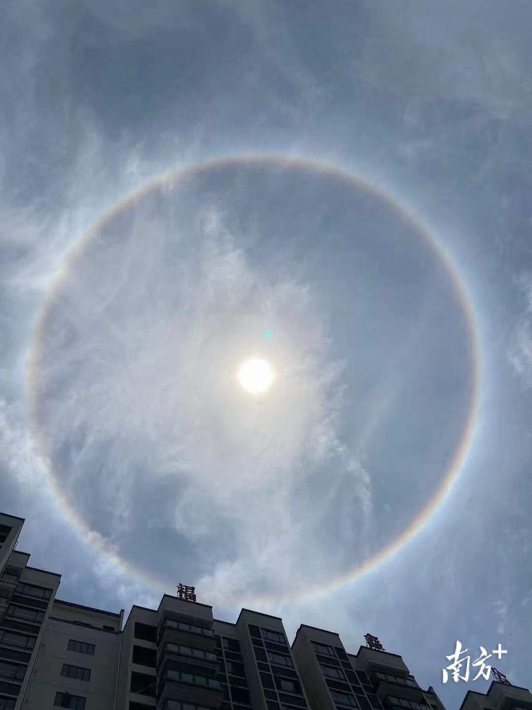 记者了解到,日晕又称为圆虹,是太阳周围出现的巨大彩色光环。惠州出现日晕奇观,是因为高空中有卷层云,其中的冰晶被太阳光折射之后出现日晕现象。云层中冰晶含量越大,光环也就越显著。
