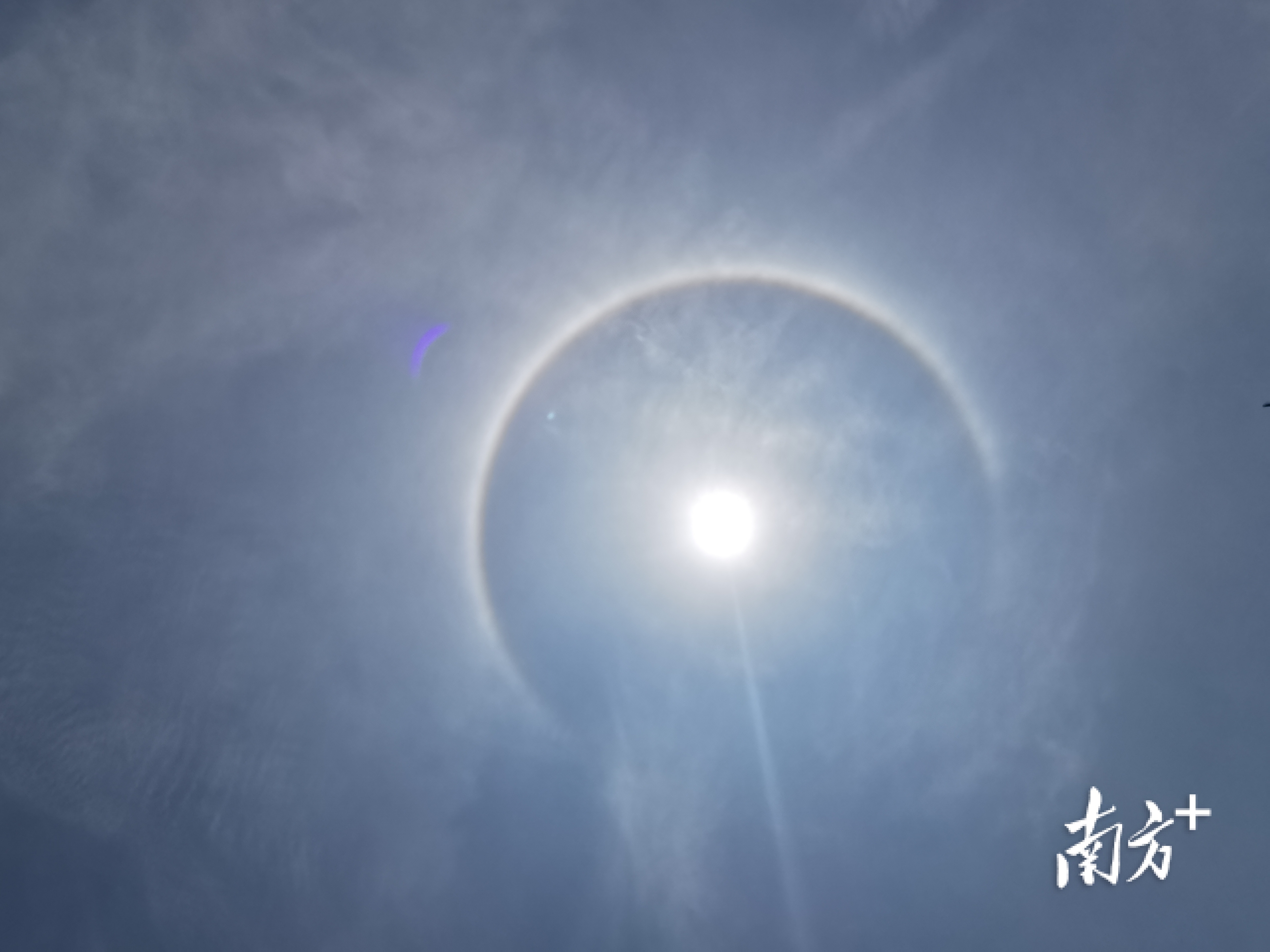 中午11时左右,太阳自带一圈彩虹光环,仿佛戴了美瞳一般,光彩夺目,市民纷纷拿起手机拍下日晕奇观,第一时间在朋友圈分享。