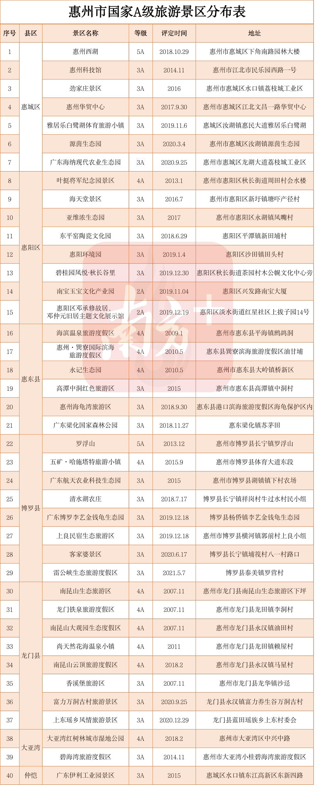 生活在惠州,旅游不用走远,家门口就有“诗和远方”。目前,惠州有国家A级旅游景区40家,其中5A级景区2家,4A级景区11家,3A级景区25家,2A级景区2家。值得一提的是,惠州40家A级旅游景区中,免费开放的景区占了近半,充分体现惠民原则。