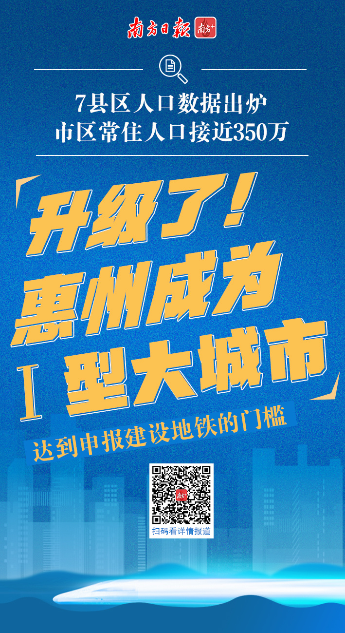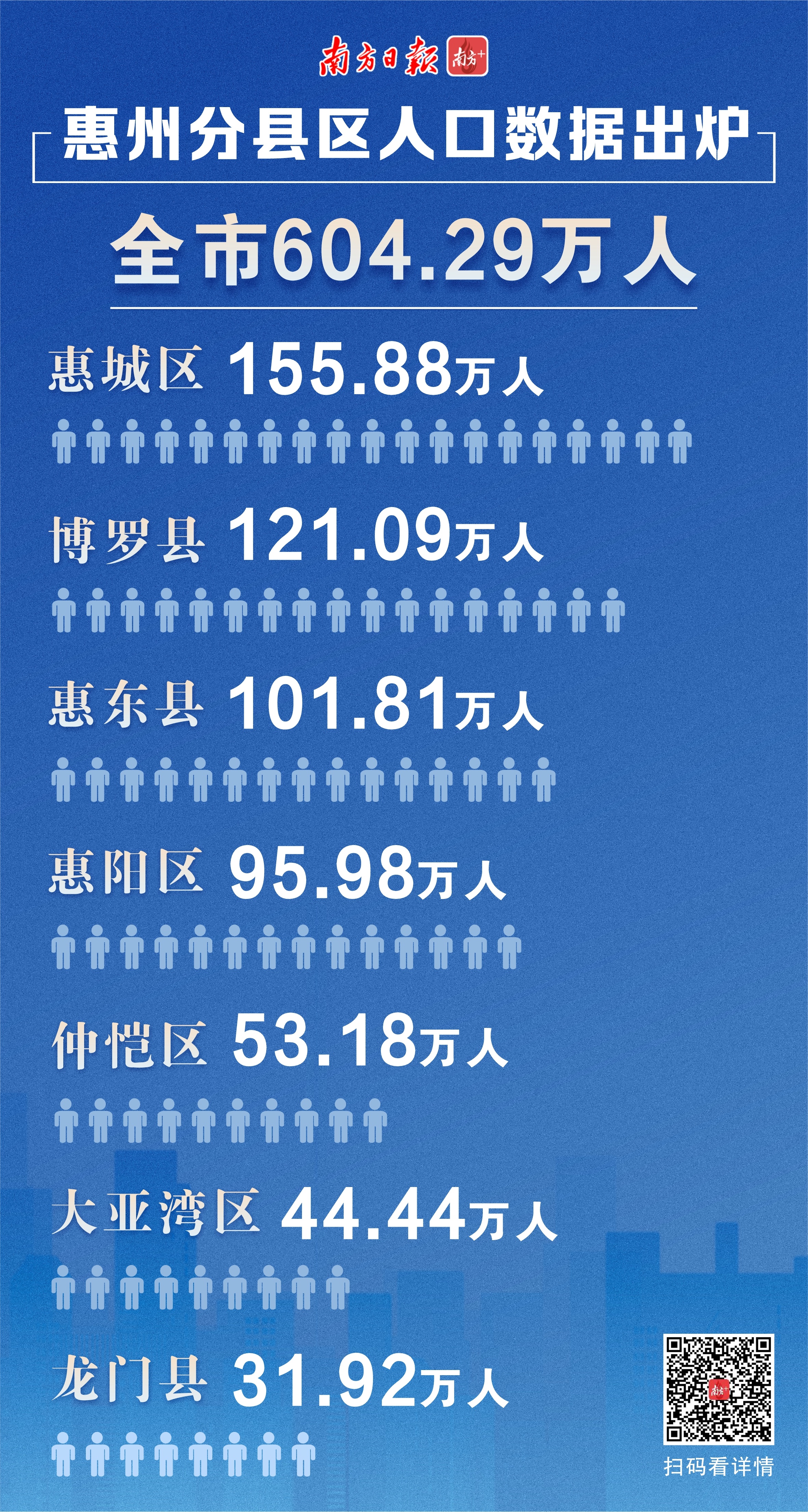 数据显示,与2010年第六次全国人口普查相比,惠州7个县区人口都呈增长态势。其中,惠城区人口增加39.43万人,惠阳区增加38.74万人,大亚湾区增加25.19万人,博罗县增加17.27万人,仲恺区增加 11.66万人,惠东县增加 11.08万人,龙门县增加1.21万人。