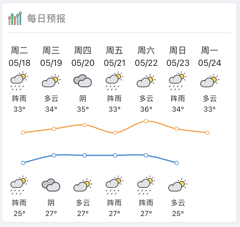 未来一周,惠州天气如何?据惠州市气象台预测,预计今天白天,惠州市各地阴天间多云,有雷阵雨局部大雨,最高气温32℃左右;19-20日,多云,有分散(雷)阵雨,气温27~34℃;21-25日,多云到晴天,午后局部有(雷)阵雨,最高气温35~36℃。
