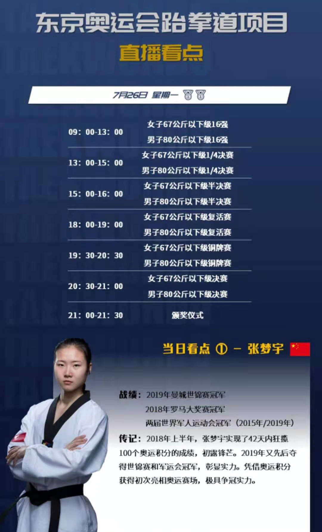 首次参加奥运会的惠州籍运动员张梦宇,今日角逐跆拳道女子67公斤以下级比赛,其上午11:30开始的首轮比赛,将面临一场硬仗。