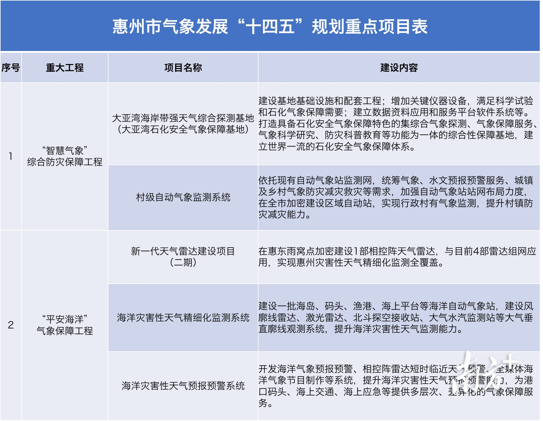 其中,“智慧气象”综合防灾保障工程包括大亚湾海岸带强天气综合探测基地(大亚湾石化安全气象保障基地)和村级自动气象监测系统两个项目,“平安海洋”气象保障工程包括新一代天气雷达建设项目(二期)、海洋灾害性天气精细化监测系统和海洋灾害性天气预报预警系统三个项目。