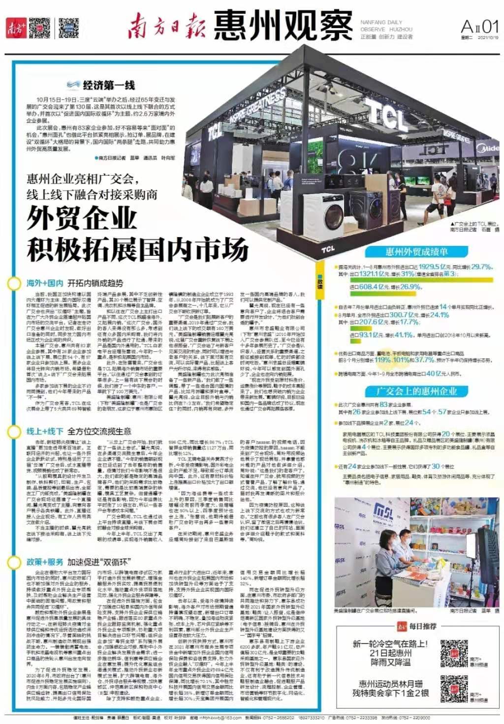 除了支持和鼓励重点企业、重点行业扩大进出口,近年来,惠州也在外贸企业拓展国内市场和加快转型升级等方面给予了支持,支持外贸企业实现国内国际双循环。