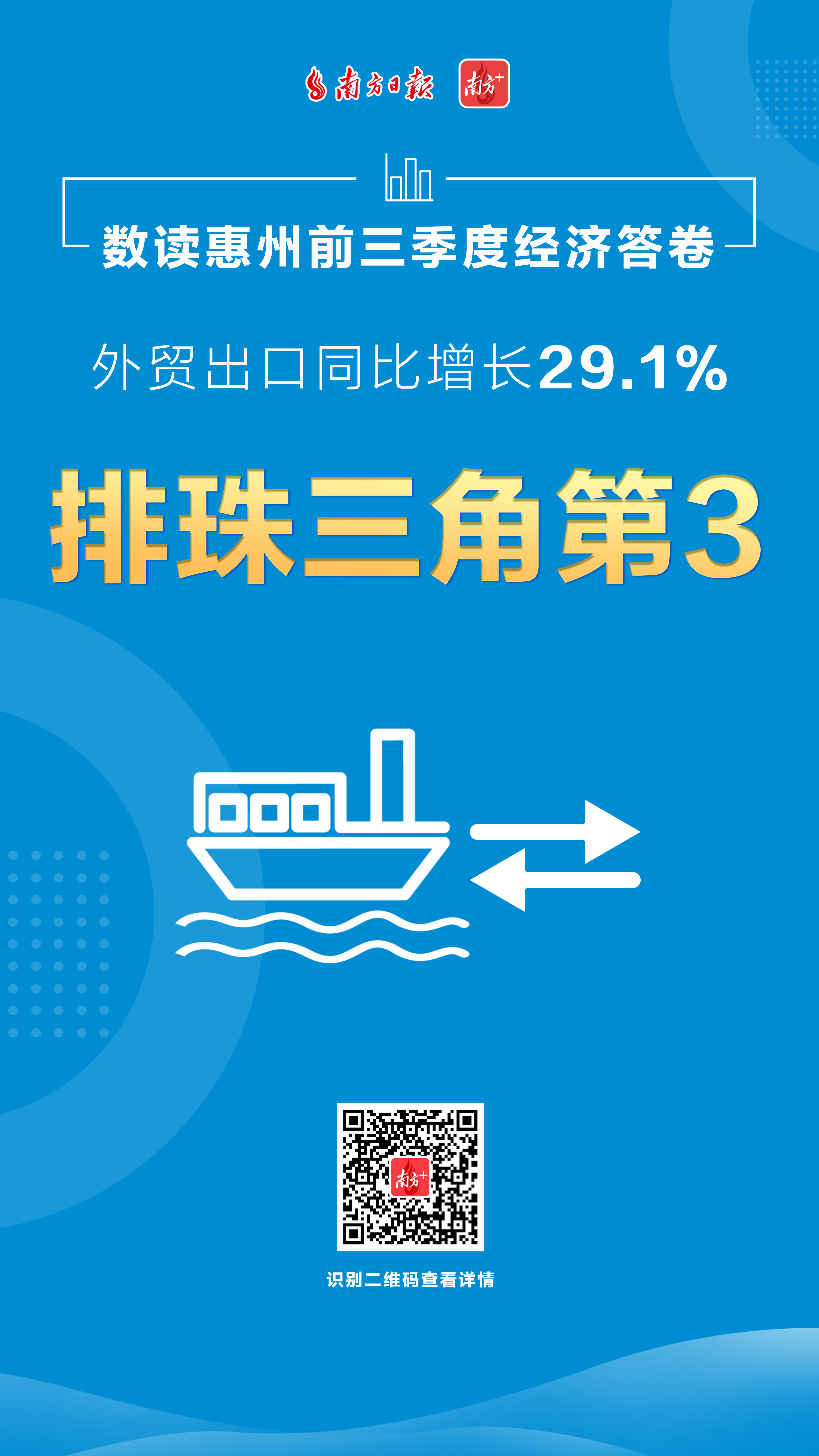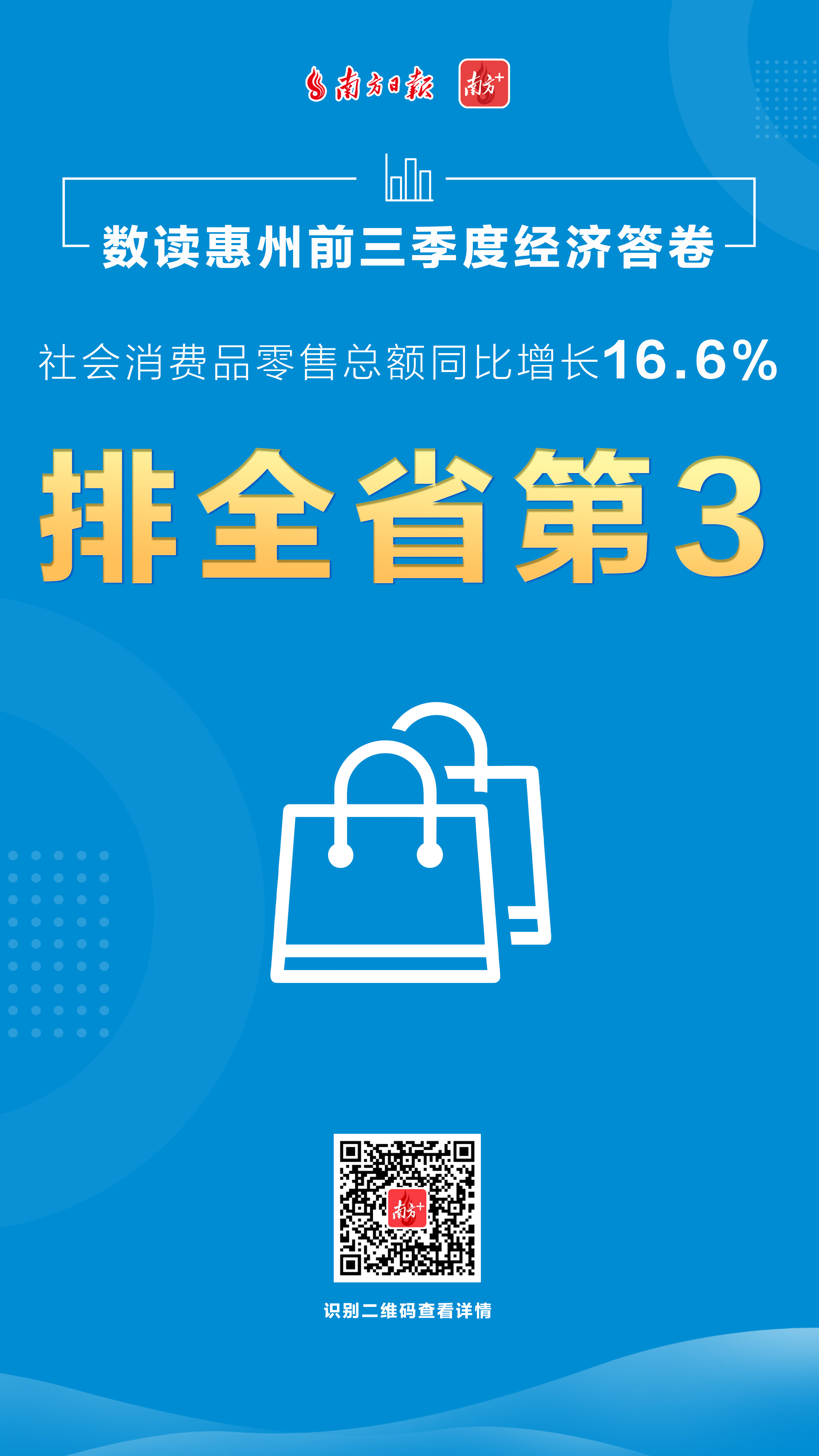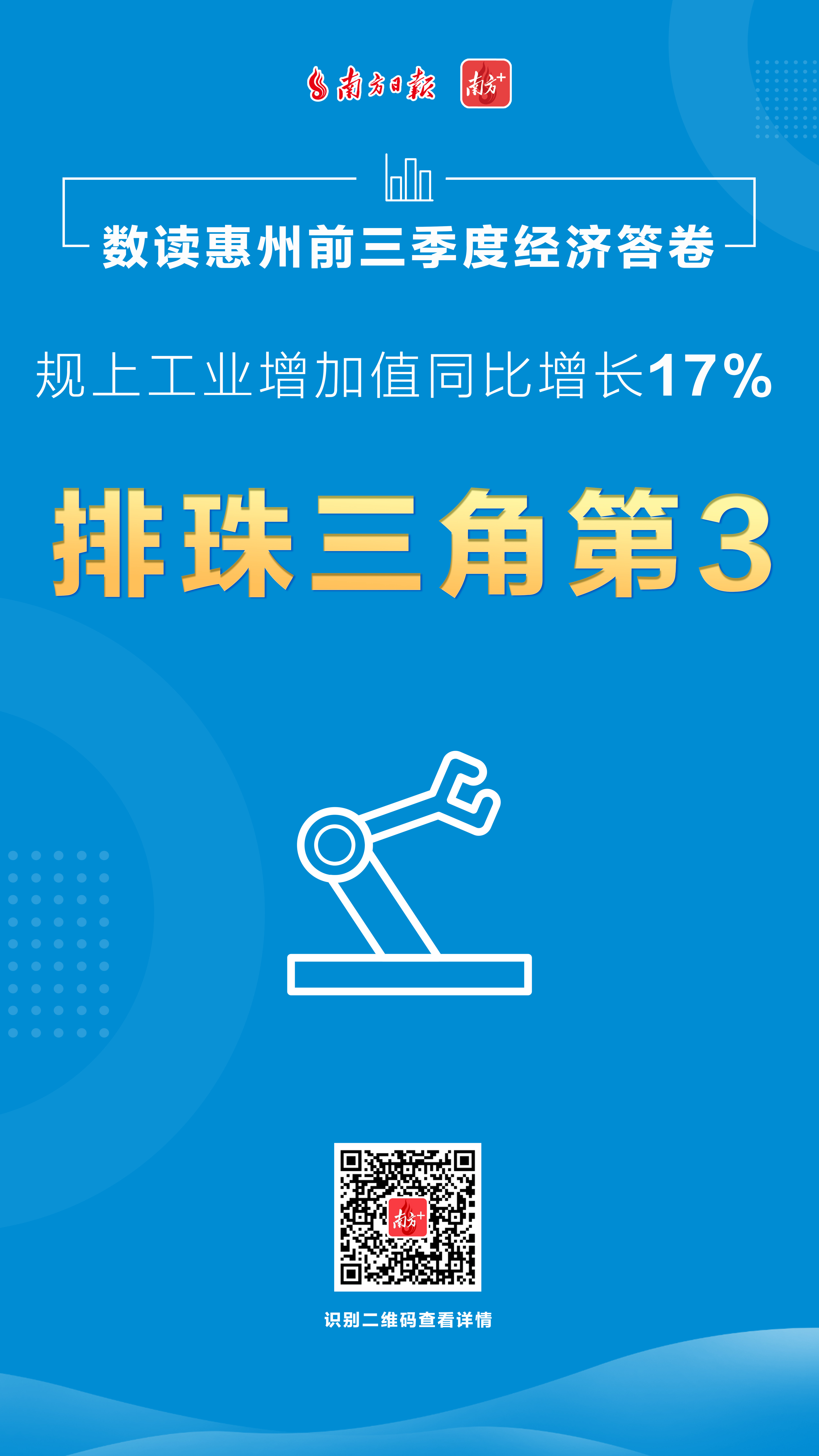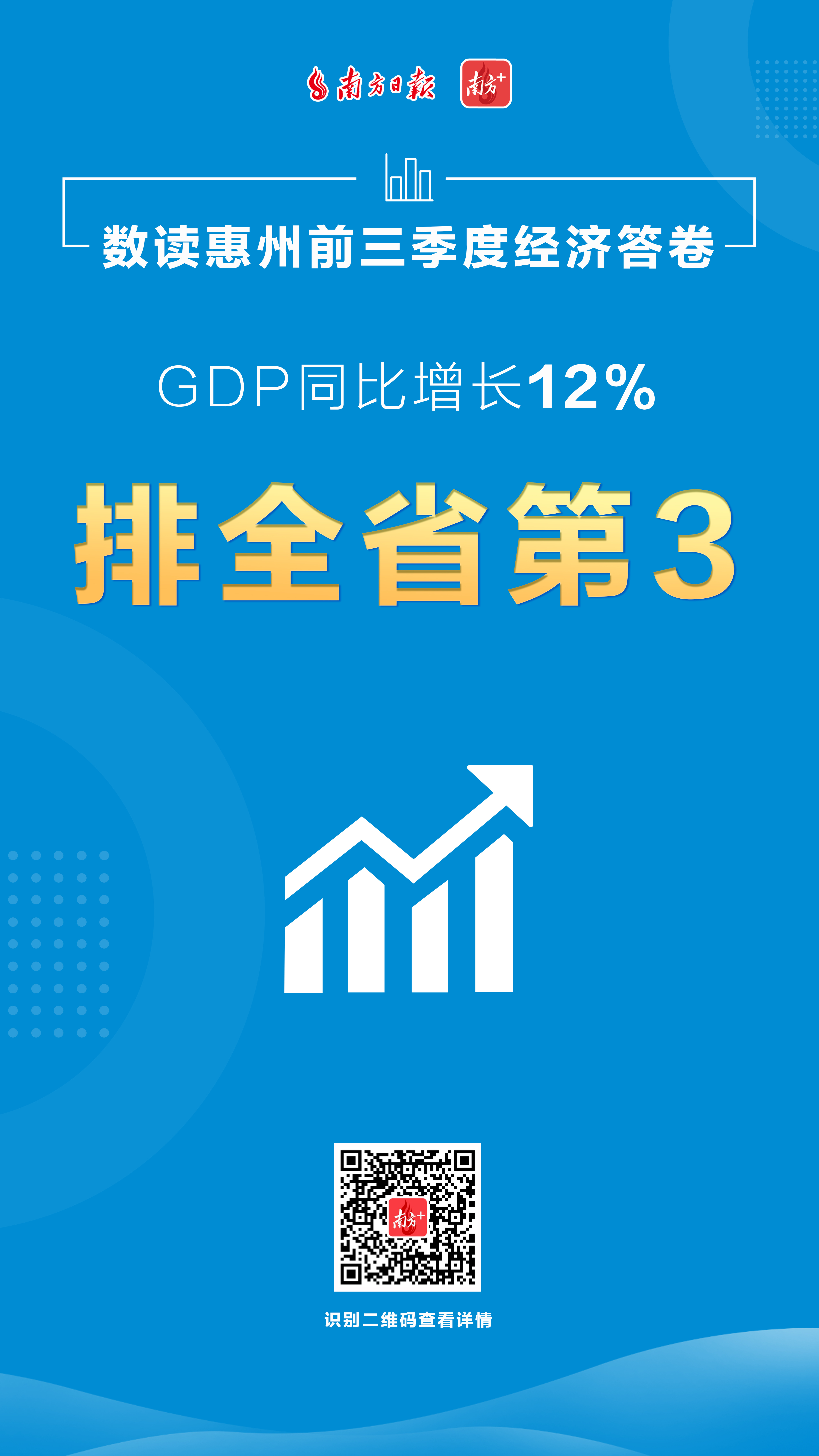 10月29日下午,南方日报、南方+记者从惠州市统计局了解到,今年前三季度惠州市地区生产总值为3490.20亿元,同比增长12.0%,增速居全省第3位;两年平均增长6.0%,居珠三角第2位。(阅读详情《刚公布,3490.2亿!惠州前三季度GDP同比增长12%》)