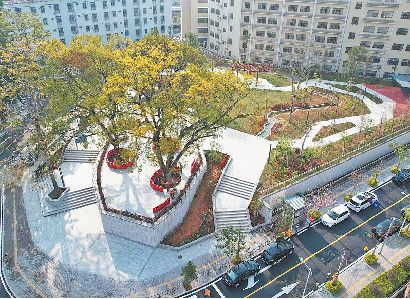 此外,与县城很多街头小公园不一样的是,龙峰公园的绿化建设颇有特色,不仅新种植了四时花木、设计了流水景观,还保留了多棵原有的古树、老树,并围绕这些老树进行了一些专门的绿化设计,让整个公园更具韵味。