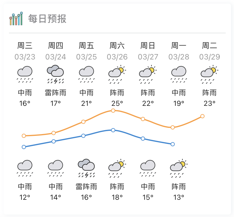 据市气象台预测,今天白天惠州市各地降雨频繁,累积雨量可达中到大雨局部暴雨,最高气温14~15℃;23日夜间-24日,中到大雨,气温13~18℃;25日-26日白天,中(雷)雨局部大雨,并伴有短时强降水、雷电、短时大风等强对流天气,气温上升;26日夜间-27日,中到强雷雨,并伴有雷电、短时大风等强对流天气,气温下降;28-30日,降水仍频繁。
