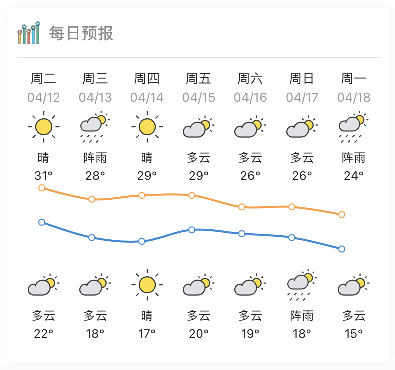 据惠州市气象台预测,13日,阴天到多云,有(雷)阵雨,局部大雨,部分地区伴有雷电、短时大风和短时强降水等强对流天气,气温22~27℃;14~15日,多云为主,气温18~29℃;16~17日,多云到阴天,局部有阵雨,日温差较小;18日,多云到阴天,有(雷)阵雨,气温略降;19日,阴天到多云。