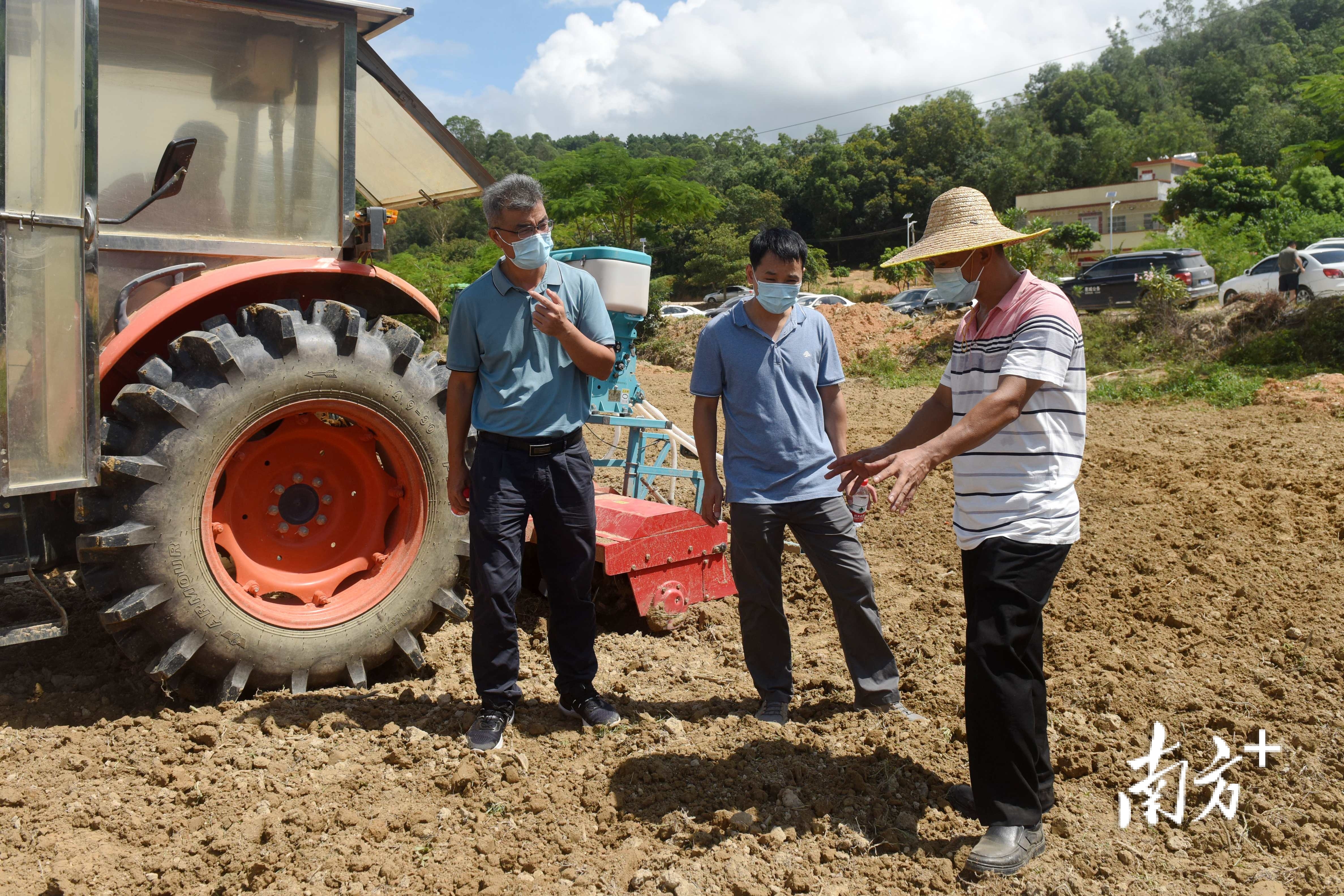 正值农作物抢收、抢种的“双抢”关键期。炎炎烈日下,在惠州横沥大岭村一片复耕农田,高级农艺师李雄兵“手把手”向当地种植大户讲授黄豆机械化种植要点,并就农机操作、撂荒地复耕复种等技术进行指导。