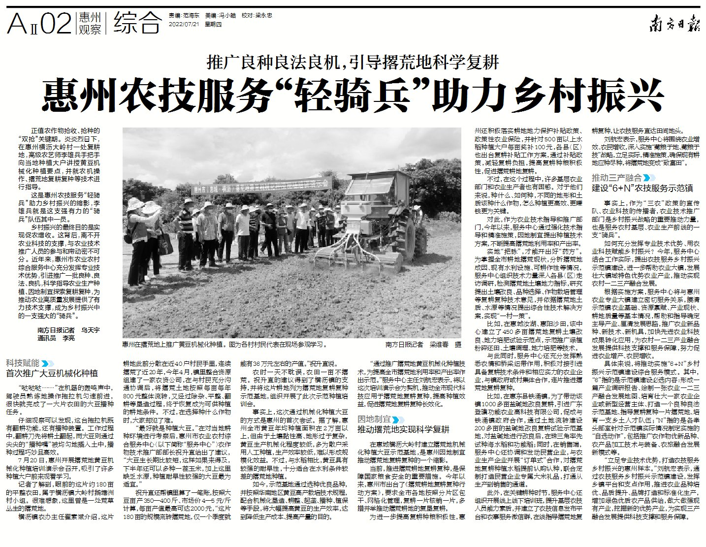 乡村振兴的最终目的是实现促农增收。这背后,离不开农业科技的支撑,也与农技推广人员的参与和带动密不可分。近年来,惠州市农业农村综合服务中心充分发挥专业技术优势,引进推广一批良种、良法、良机,科学指导农业生产种植、因地制宜探索复耕复种,为推动农业高质量发展提供了有力技术支撑,成为乡村振兴中的一支强大的“骑兵”。