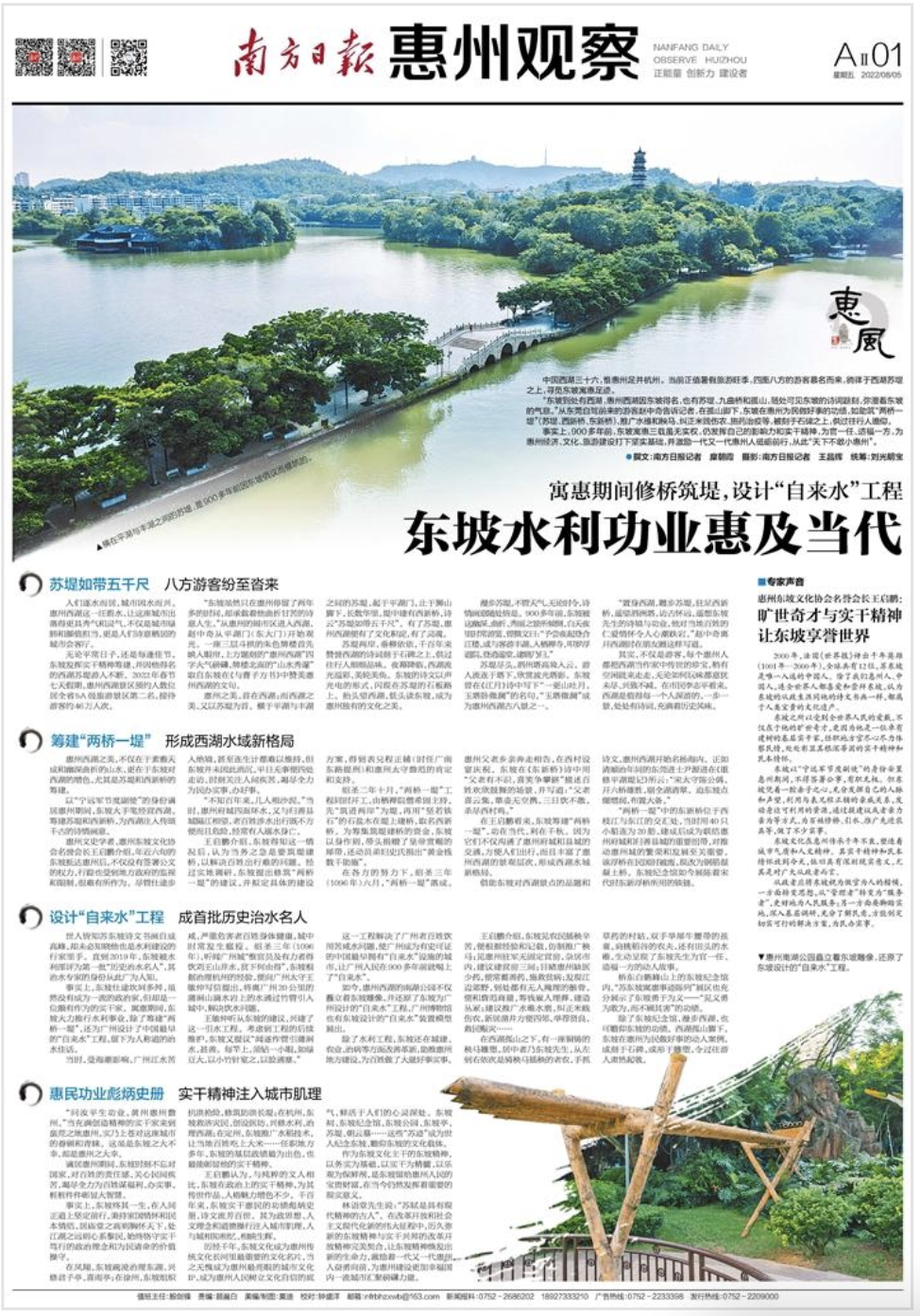 在王启鹏看来,东坡筹建“两桥一堤”,功在当代,利在千秋。因为它们不仅沟通了惠州府城和县城的交通,方便人们出行,而且丰富了惠州西湖的景观层次,形成西湖水域新格局。