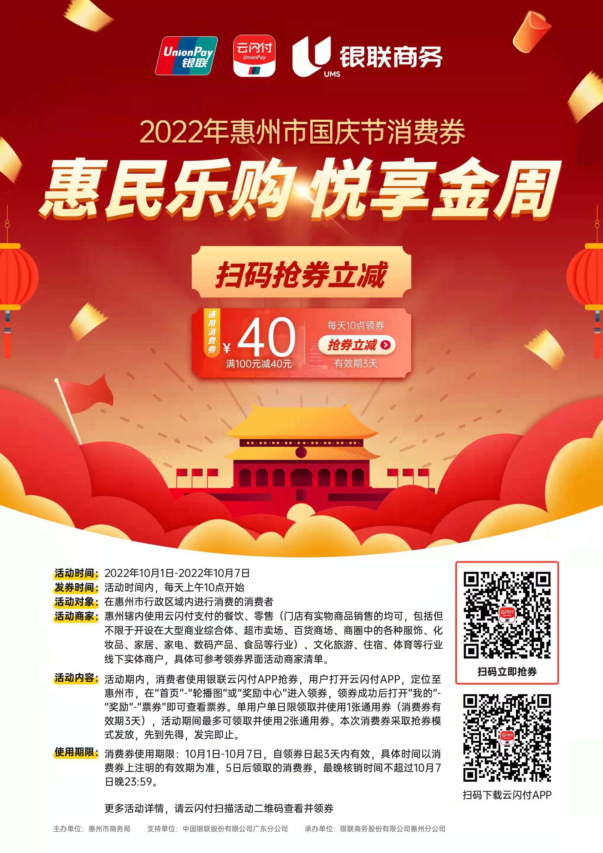 为抢抓“十一”国庆黄金周和秋季消费旺季,惠州市商务局于2022年9月29日至10月7日继续开展“惠民乐购”第二期第三轮消费券发放活动。本次活动包含银联云闪付APP、微信“惠州消费券”两个平台参与,发放总金额约620万元。详情>>>