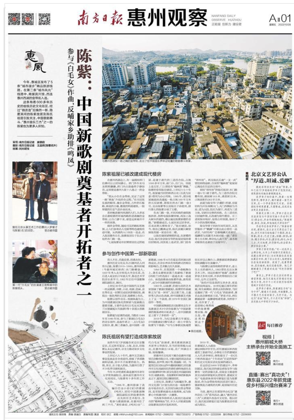当前,惠州正在谋划举办纪念“惠州音乐三杰”系列活动,融入“惠州音乐三杰”元素提升改造市文化馆。假以时日,陈氏祖居修复打造为陈紫故居有望成为现实。