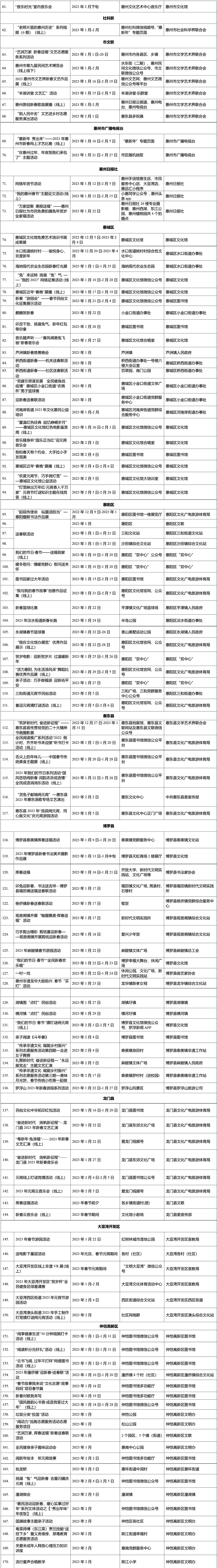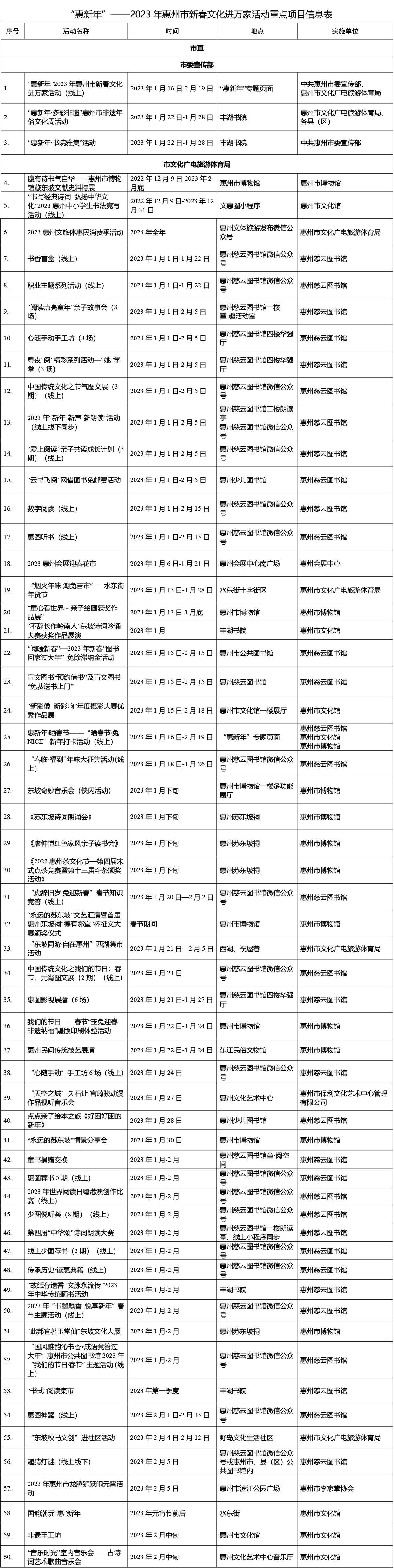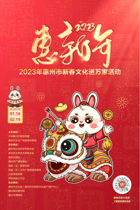 到各大公共文化场馆打卡、参加线上线下各类文化活动、感受传统中国年味、云上赏戏剧……记者从惠州市委宣传部获悉,“惠新年”——2023年惠州市新春文化进万家活动于1月16日全面启动,并将持续到2月19日,覆盖整个农历新年。