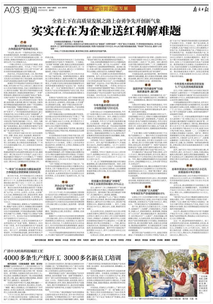 去年6月,惠州建立“1+6+1”重大工程建设指挥部专班运作体系,推动项目建设提速提效。数据显示,惠州去年GDP增长4.2%、固定资产投资增长8.8%,增速均居全省第一。其中,工业投资完成1397亿元、增长42%,总量、增速均居全省第二。