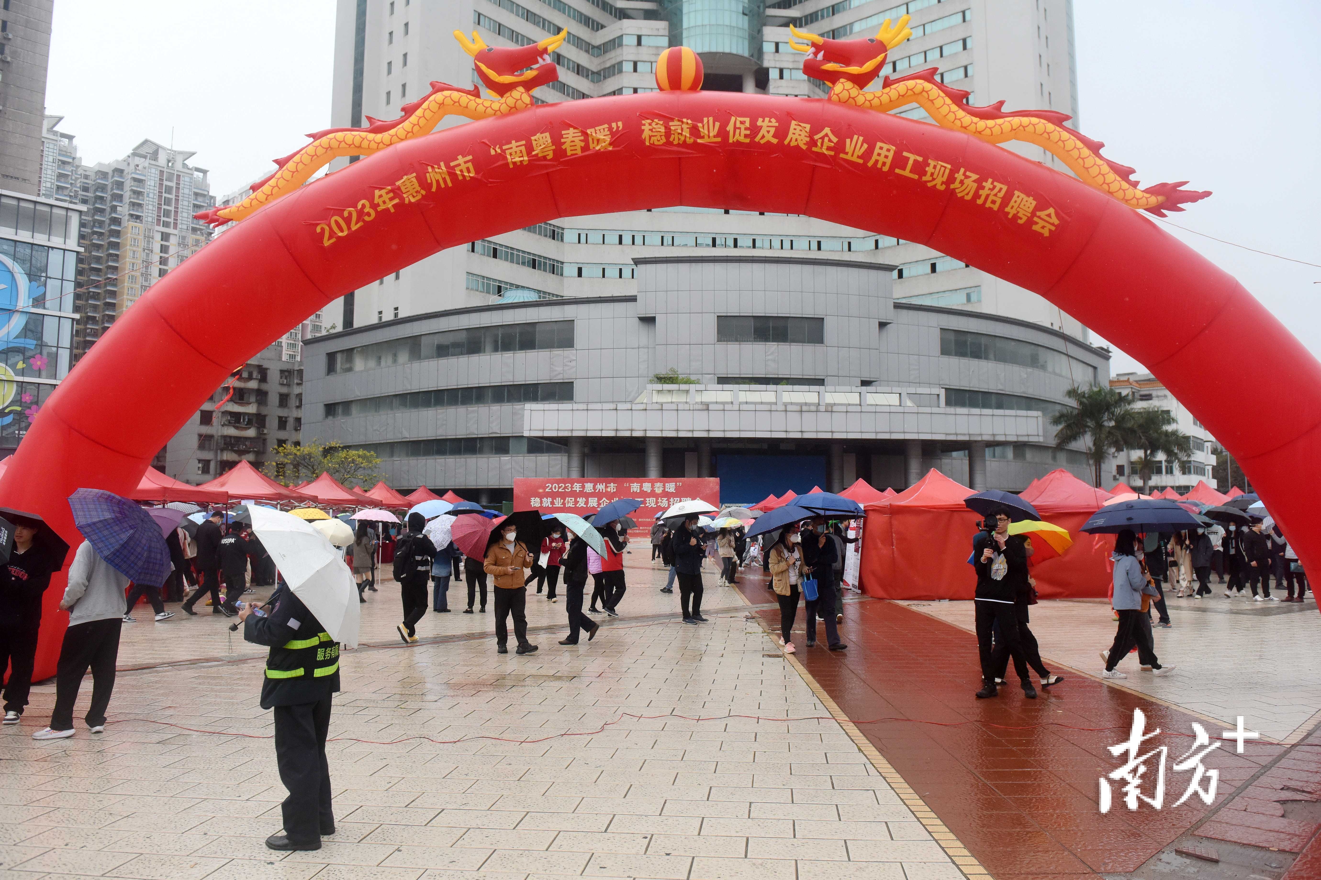 2月4日,立春时节。虽然天空下着小雨,惠城区花边岭广场却是一番热闹景象。在这里,2023年“南粤春暖”惠州市首场大型现场招聘会正在举行。当天,惠州218家企业带来1.28万个岗位,进场人数达2700人次。“包吃住吗?”“待遇怎么样?”“交五险一金吗?”求职者和各企业招聘人员围绕任职条件、工资待遇、工作生活环境等内容进行了热烈交流。