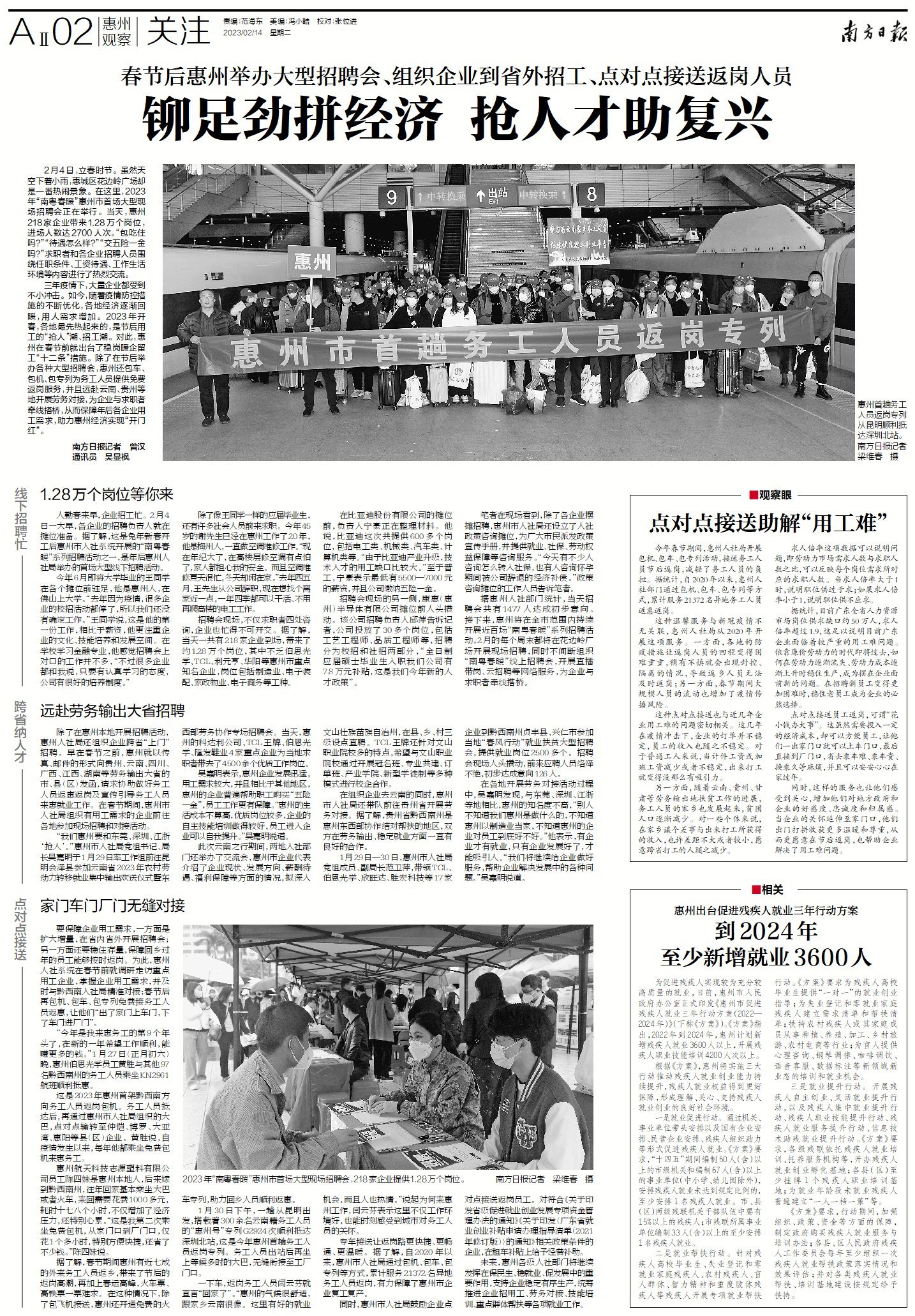 要保障企业用工需求,一方面是扩大增量,在省内省外开展招聘会;另一方面还要稳住存量,保障回乡过年的员工能够按时返岗。为此,惠州人社系统在春节前就调研走访重点用工企业,掌握企业用工需求,并及时与黔西南人社局精准对接;春节后再包机、包车、包专列免费接务工人员返惠,让他们“出了家门上车门,下了车门进厂门”。