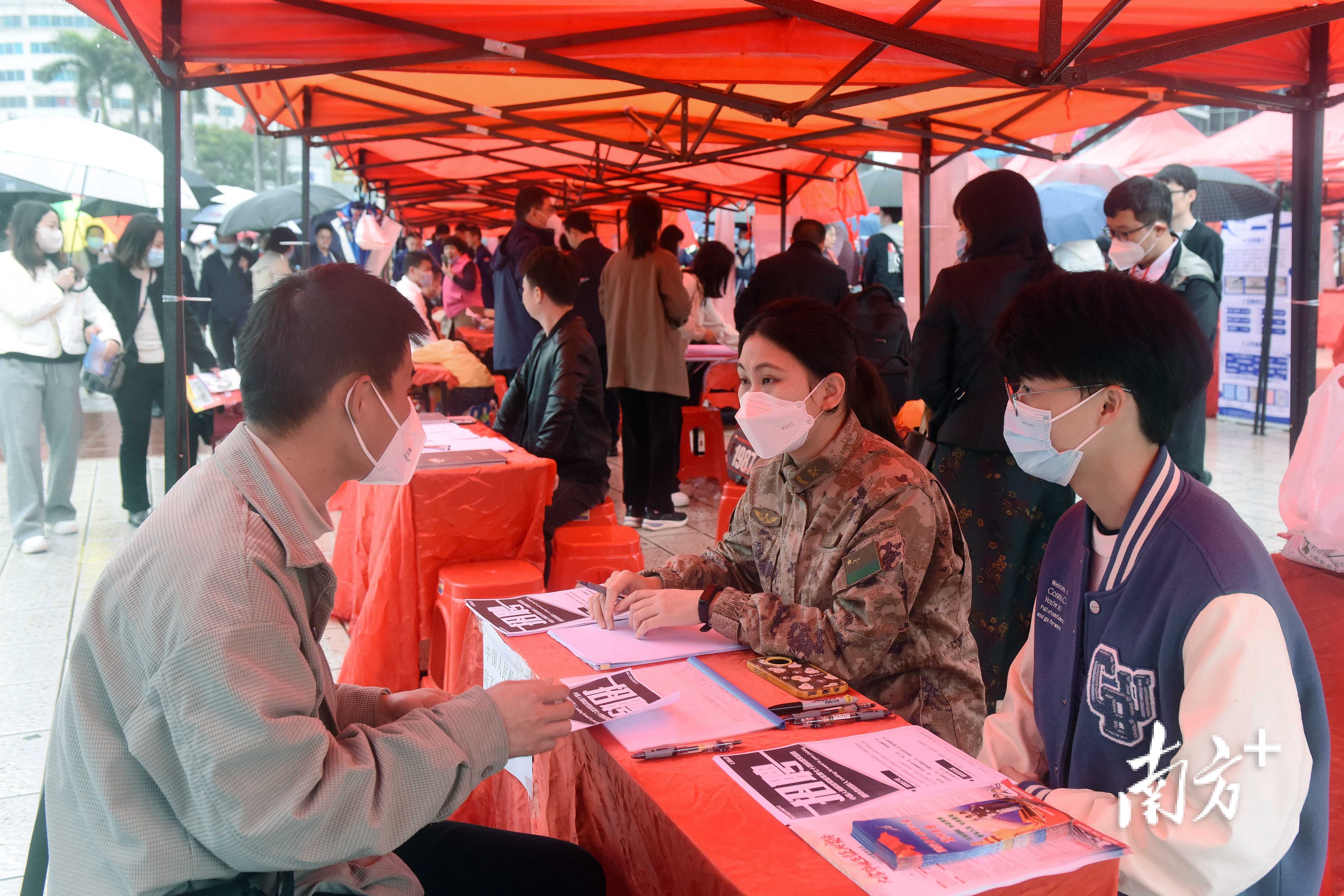 今年6月即将大学毕业的王同学在各个摊位前驻足,他是惠州人,在佛山上大学。“去年因为疫情,很多企业的校招活动都停了,所以我们还没有确定工作。”王同学说,这是他的第一份工作,相比于薪资,他更注重企业的文化、技能培养和发展空间。在学校学习金融专业,他感觉招聘会上对口的工作并不多,“不过很多企业都和我说,只要有认真学习的态度,公司有很好的培养制度。”