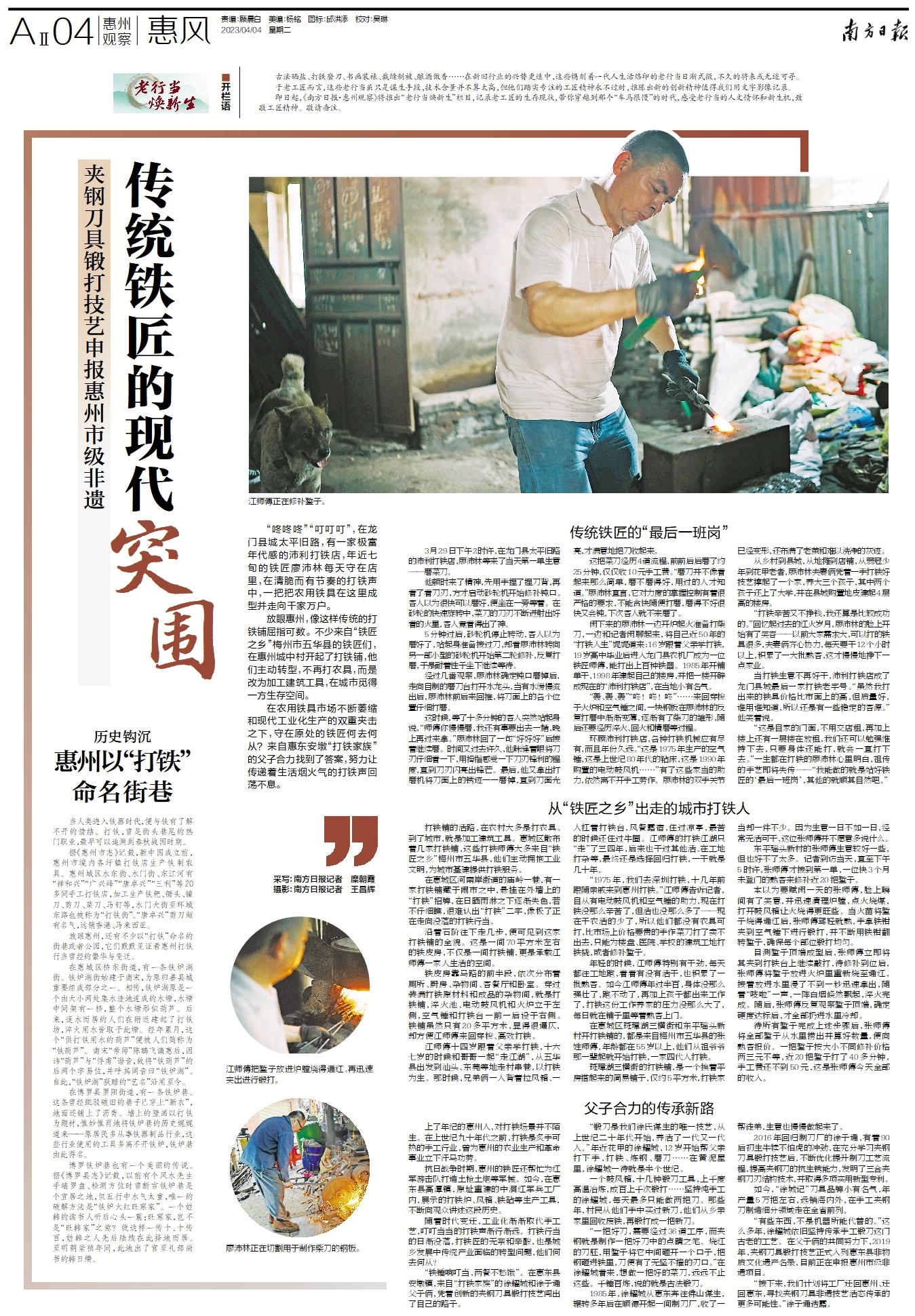 “铁锤响叮当,两餐不愁饿”。在惠东县安墩镇,来自“打铁家族”的徐耀城和徐子通父子俩,凭着创新的夹钢刀具锻打技艺闯出了自己的路子。