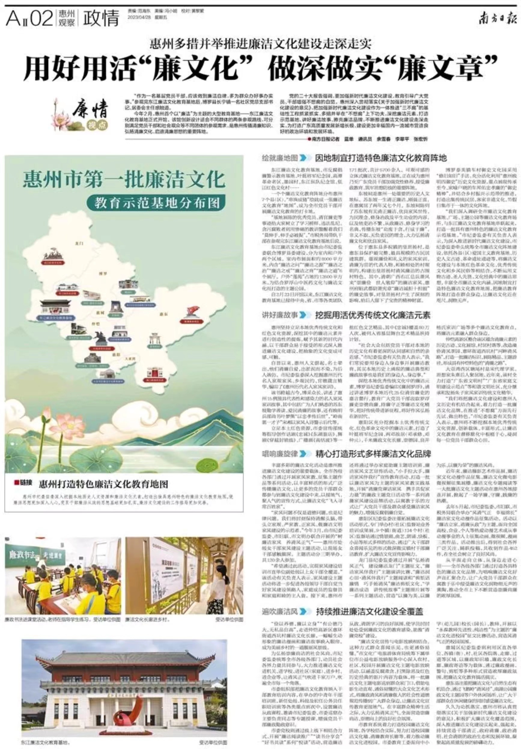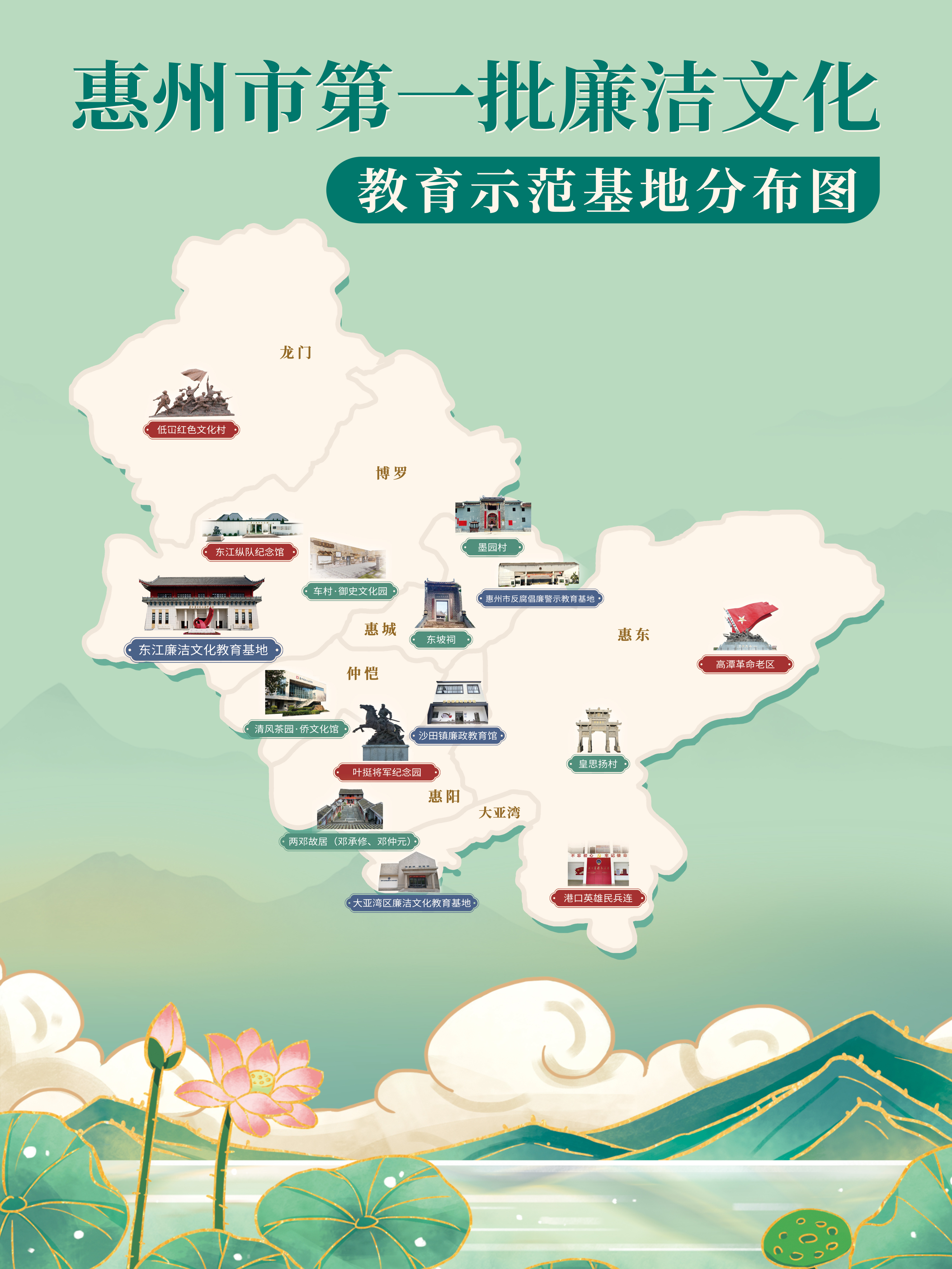 惠州市纪委监委深入挖掘本地历史人文资源和廉洁文化元素,打造出独具惠州特色的廉洁文化教育地图,使廉洁思想更加深入人心,党员干部廉洁从政的思想基础更加扎实,廉洁文化建设的工作格局更加完善。