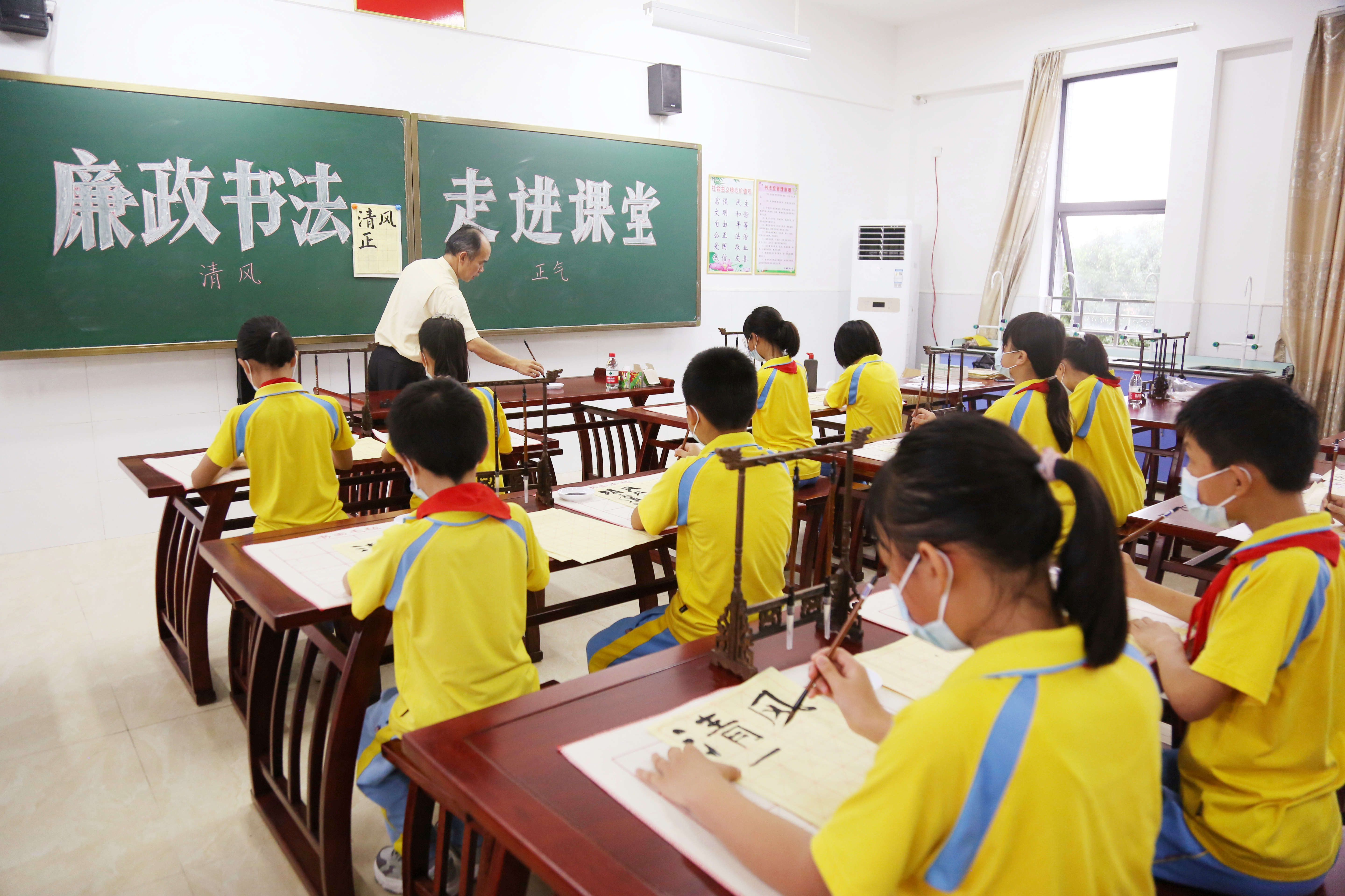 廉政书法进课堂,老师在指导学生写毛笔字。