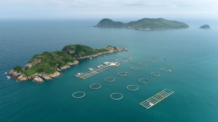 在惠东小星山附近的圣告岛,从无人机拍摄的画面看见,壮阔的海面上排列着一个个“圆环”。圆环下方围着一张大网,这并不是在捕鱼,而是一方海(广东)海洋牧场有限公司的深海养殖设备——深海网箱。