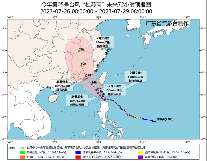 7月26日08时,台风“杜苏芮”中心位于距离惠州市惠东县东南方向约800公里的洋面上,中心附近最大风力17级(58米/秒)。