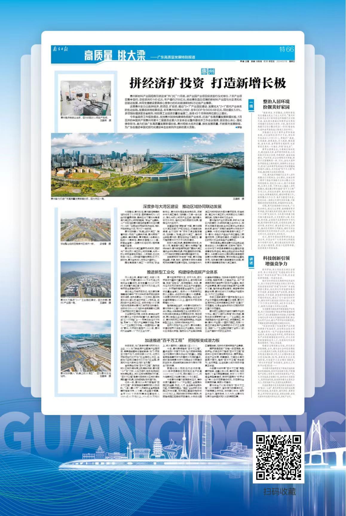 今年省政府工作报告提出,支持惠州加快构建绿色低碳产业体系、打造广东高质量发展新增长极。1月召开的中国共产党惠州市第十二届委员会第六次全体会议暨市委经济工作会议强调,坚定信心决心、强化使命担当,奋力打造广东高质量发展新增长极。惠州将做大经济总量、做优发展质量,不断提升发展能级,为广东在推进中国式现代化建设中走在前列作出新的更大贡献。