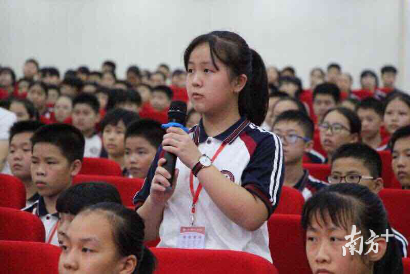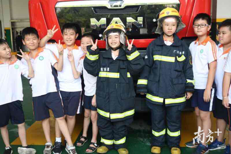 “如果手指被夹到要用哪个工具?”、“被困在电梯里要怎么办?”大朗消防大队教员一一作出解答。师生们近距离接触消防车,共同感受“出车”体验。