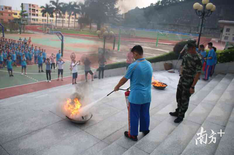 为使师生们深入学习消防知识及实用技能,谢岗专职队骨干操作如何使用干粉灭火器进行灭火,学生们按顺序亲身体验使用。