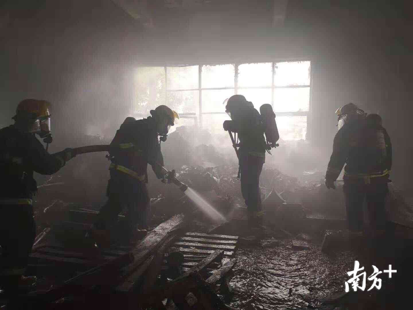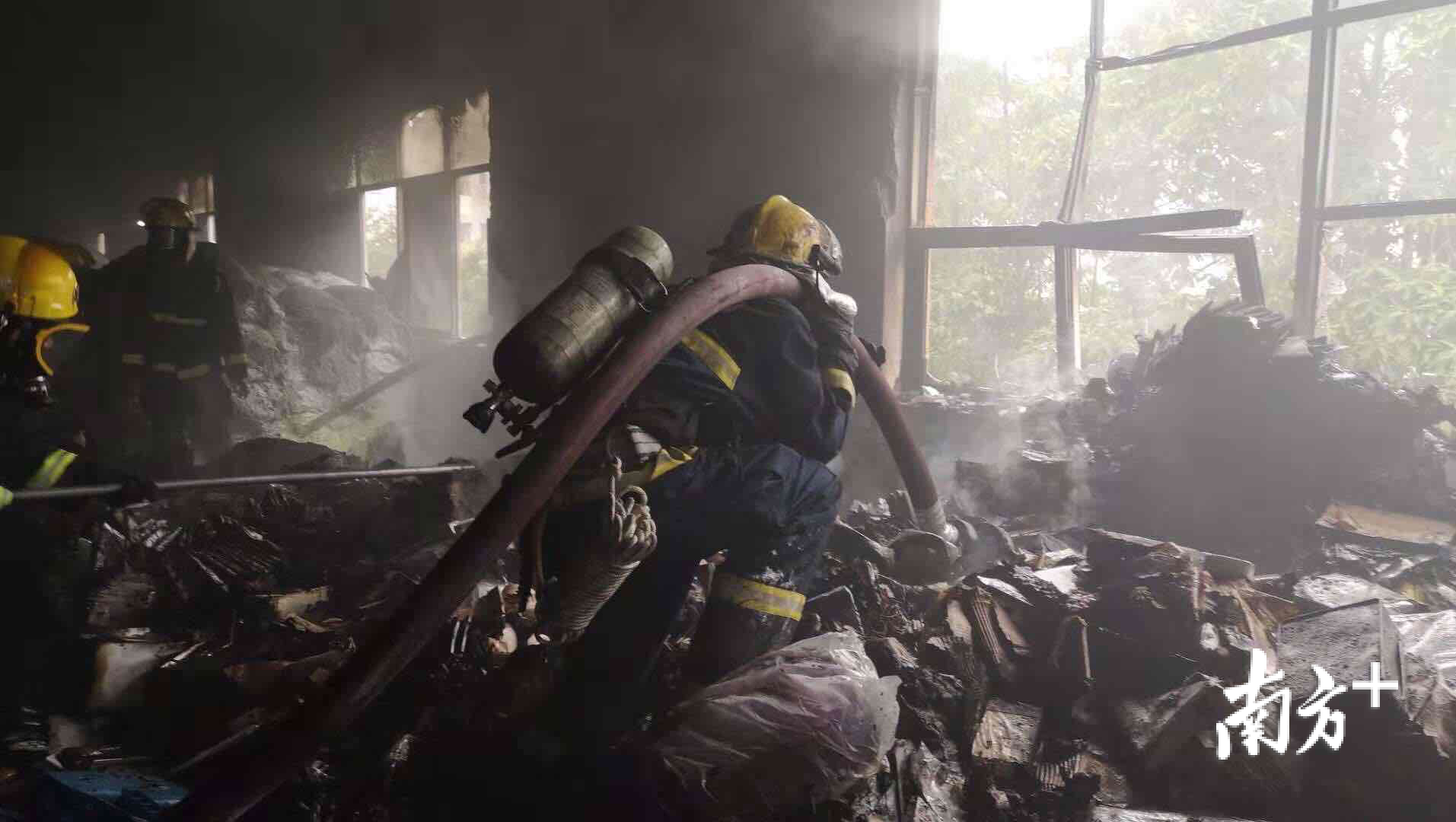 消防员们发现着火位置靠近窗边,便立即派出车辆到厂房围墙后面出水往火点射水,待温度降低后马上进行内攻。