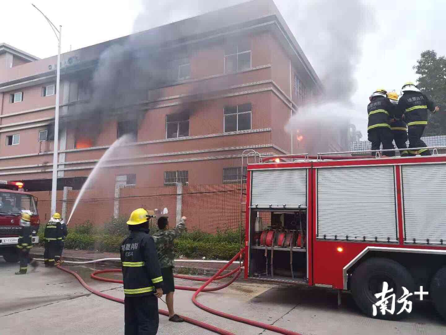 塘厦消防大队立刻派出消防队前往救援。消防员到达现场后了解情况,着火位置是莆心湖大道北2—6号的某厂2楼厂房,经过指挥员迅速的现场勘查后,发现着火楼层温度太高,浓烟太大,暂时不能内攻。