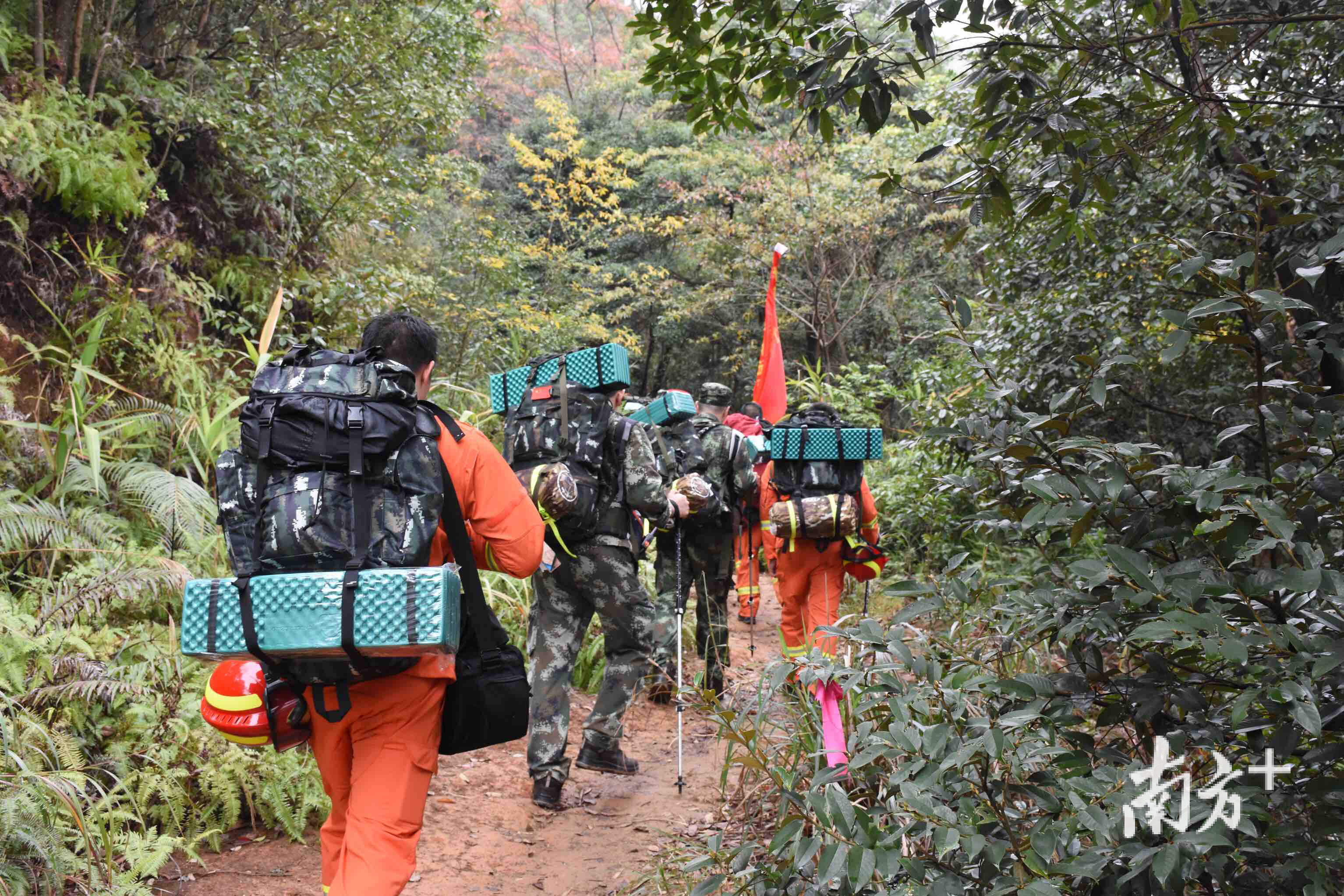 此次负重越野,行程10公里,历时近9小时,全程密林山路,穿越难度相对较大。每名队员负重达70斤以上,主要包括个人防护装备、食物、医疗救护用品和生命探测仪、无人机、发电机、千斤顶、工兵铲、担架等救援装备。越野路线主要以山路为主,体力消耗特别大,在山坡及山脊行进坡度大,加之天气潮湿,山路湿滑,稍有不慎就有摔倒的危险。沿途,教练向队员传授深山越野的技巧以及野外辨别方向的知识。经过数小时路程,天色渐暗,加之山上海拔升高、空气稀薄、体能消耗等因素,对队员的身体和意志造成巨大冲击,行进过程中海拔最高点达1105米,沉重的背包和陡峭的山坡没有让他们放慢脚步,在坚强的毅力支撑下没有一个人掉队。经过近9小时翻山越岭,全体队员不畏艰险、相互扶持,大部队于20时30分顺利到达驻扎营地,顺利完成负重深山越野。