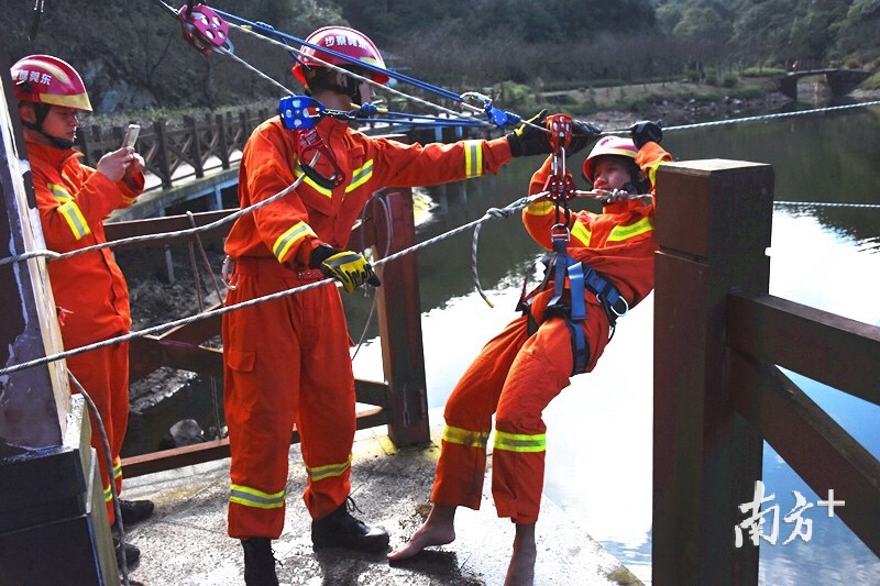 在开展绳索横渡救援科目训练方面,因地处深山,受到低温、大雾视线受阻等因素影响,且两岸直线距离达40米,横渡救援难度较大,救援队伍对周边环境进行认真勘察并制定科学救援方案,采取利用滑轮组作出4倍拉力进行绳索救援,另一支点利用国际通用易解结进行固定的方式,安全顺利完成绳索横渡救援训练。此次拉练除了学习各类救援技术,还重点学习掌握紧急救护技能,包括抢救伤员、心肺复苏及止血包扎等基本急救动作要领和操作程序,巩固提高参训人员紧急救护水平。