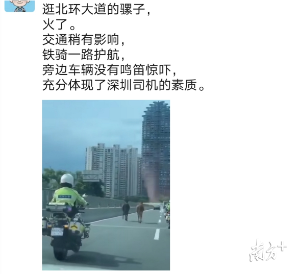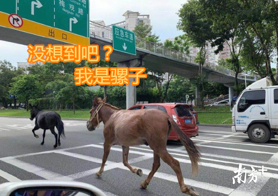 在周一早高峰,两头逗得深圳人乐呵呵的骡子出现在北环大道。从南山塘朗山隧道到罗湖春风高架, 骡子们狂飙突进26公里。一路上周围车辆纷纷避开行驶,不鸣笛、不抢道,没有惊吓到骡子,这才保障了早高峰交通的平稳有序。其中也体现了深圳司机的文明指数。