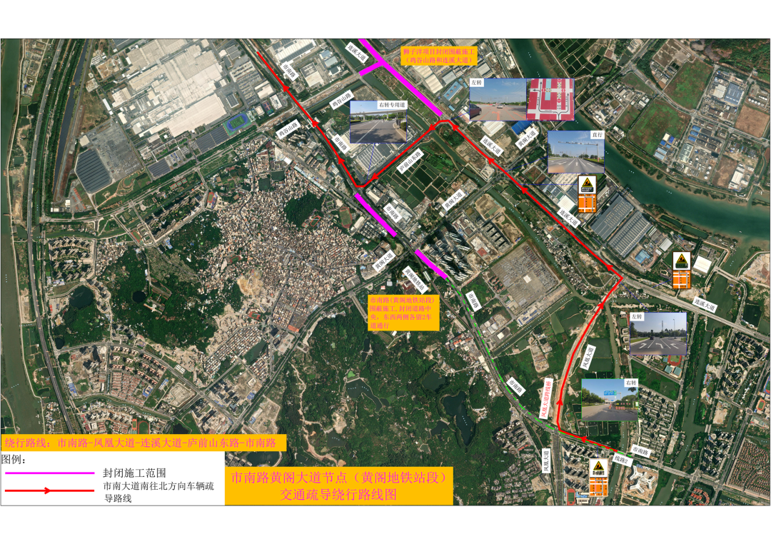 若从市南路(凤凰大道路口)前往黄阁立交方向:可从市南路(凤凰大道路口)→(右转)到凤凰大道→(左转)进入连溪大道→(左转)到庐前山东路→(右转)进入市南路。