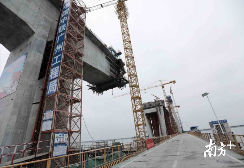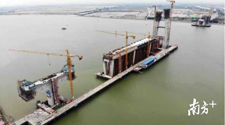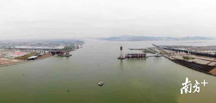 据介绍,龙穴南水道特大桥主桥设计为双塔混合梁斜拉桥的形式,全桥长830米,是该标段的关键控制性工程。1月25日,龙穴南水道特大桥刚刚完成了2个钢混段的架设,这意味着,该桥将顺利在春节后启动钢梁架设,建设进程也将逐步从边跨转向中跨,预计今年8月底即可实现合拢。