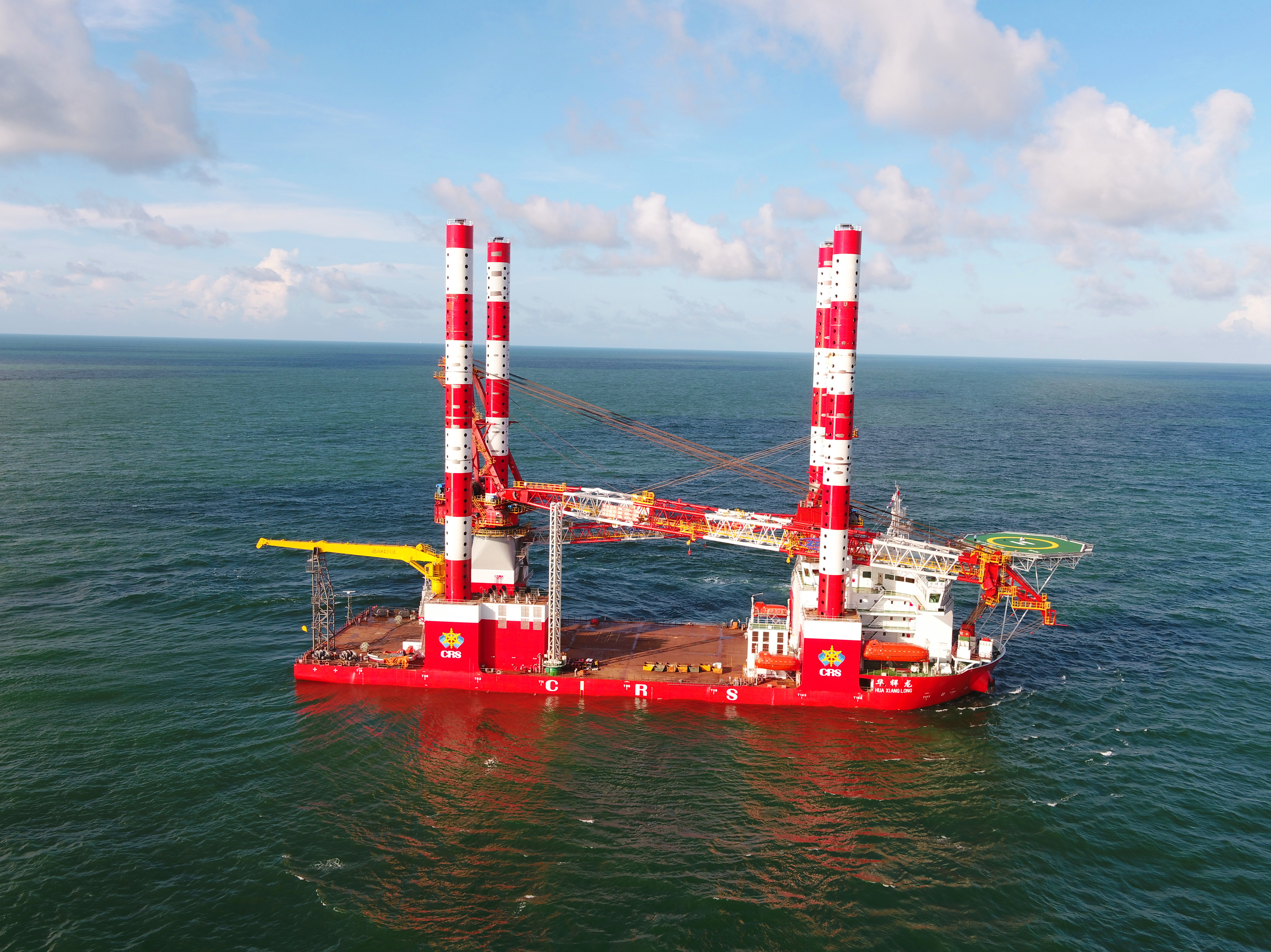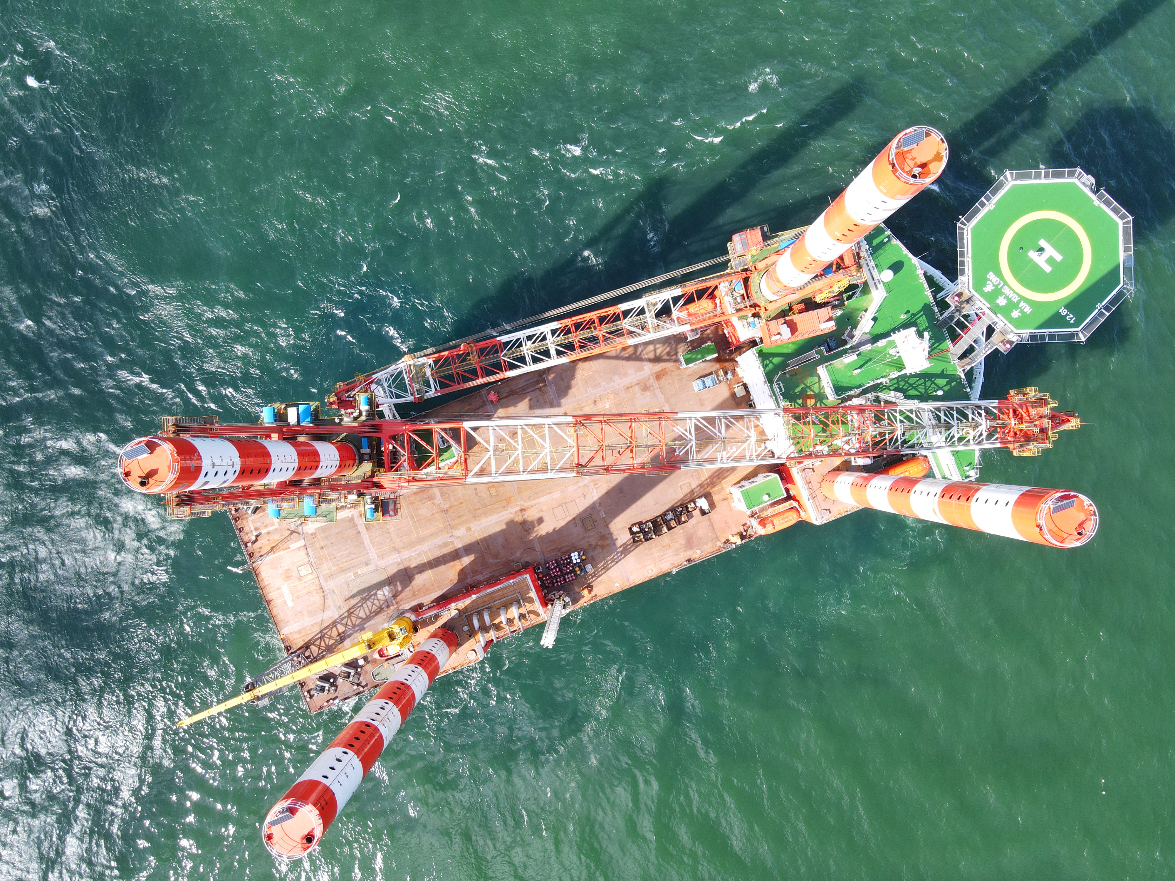 记者在现场看到,船身总长130米,长着“四条腿”的大船,“腿”长高度90米,是用于配备对应的4套液压插销式双动环梁升降系统和冲桩系统。“华祥龙”依靠自身DP2在海上精准定位后,就能靠桩腿牢牢站立在海上作业点,单桩最大举升能力5600吨,作业水深(包括潮差)可达50米。